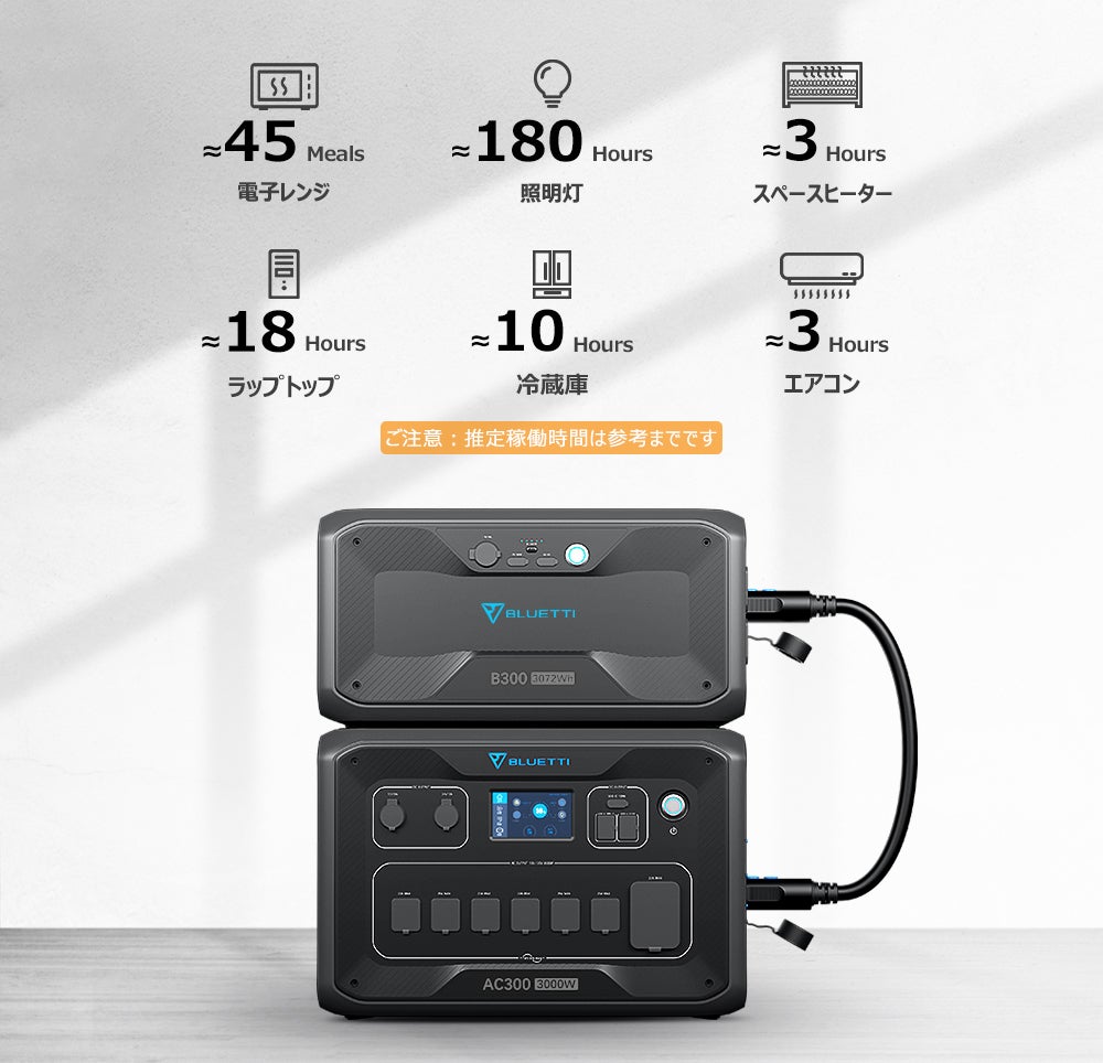 A8: BLUETTI AC300+B300 の出力は3000Wまでの電気製品をご利用いただけます。お手持ちの電気製品の最大消費電力をご確認ください。一般的な電気製品の消費電力を目安として掲載(製品背面、取扱説明書など)しております。