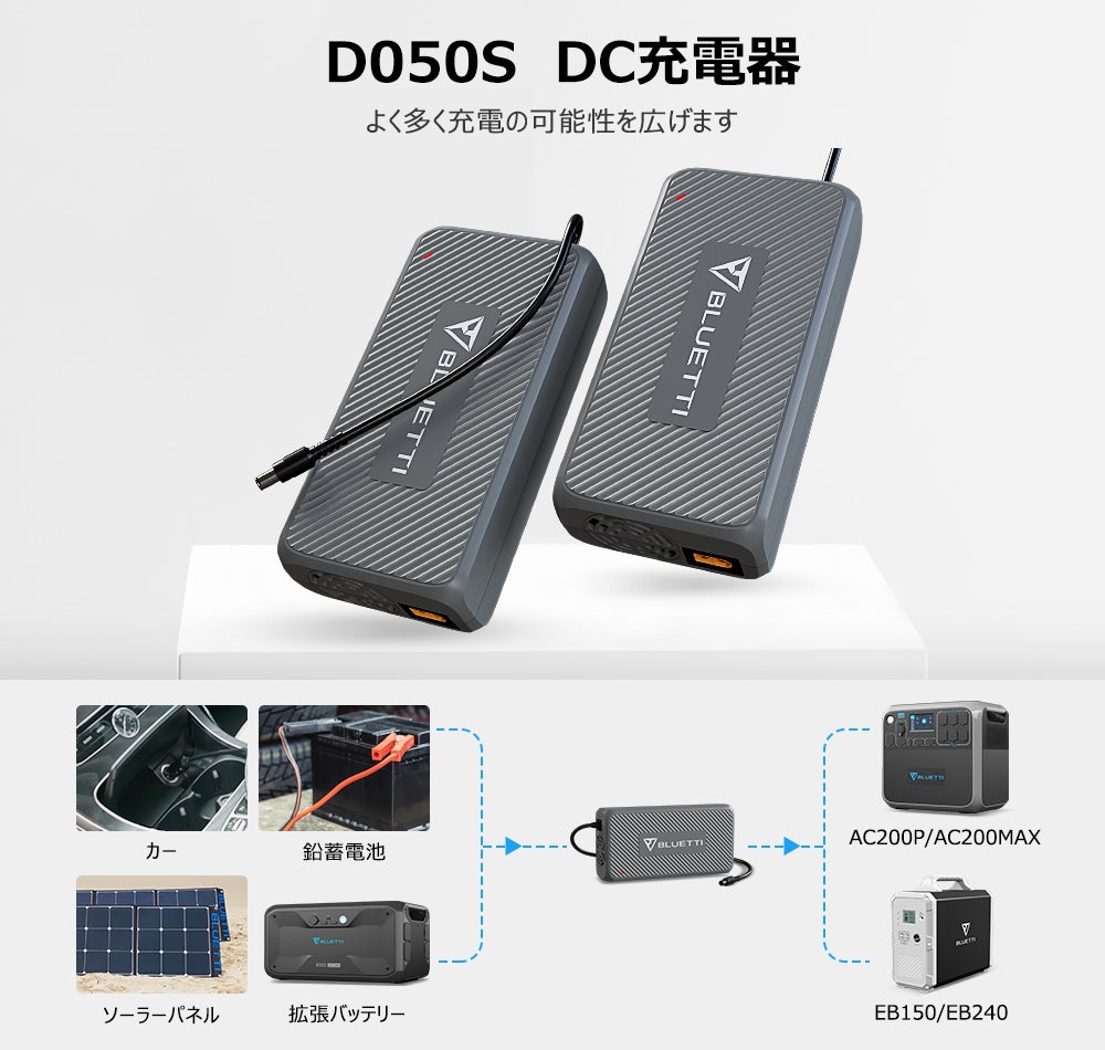 BLUETTI D050S DC充電器があれば、充電方法を増やし、もっと楽しみを増やします。