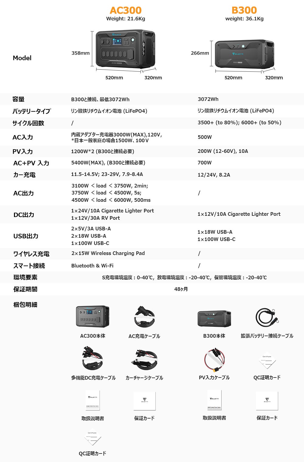 A12: BLUETTI AC300+B300 本体の保証期間は48ヶ月です。ソーラーパネルとケーブルの保証は24ヶ月です。保証期間内弊社の日本人スタッフより責任を持って アフタ・サービスを提供しておりますので、ご安心ください。