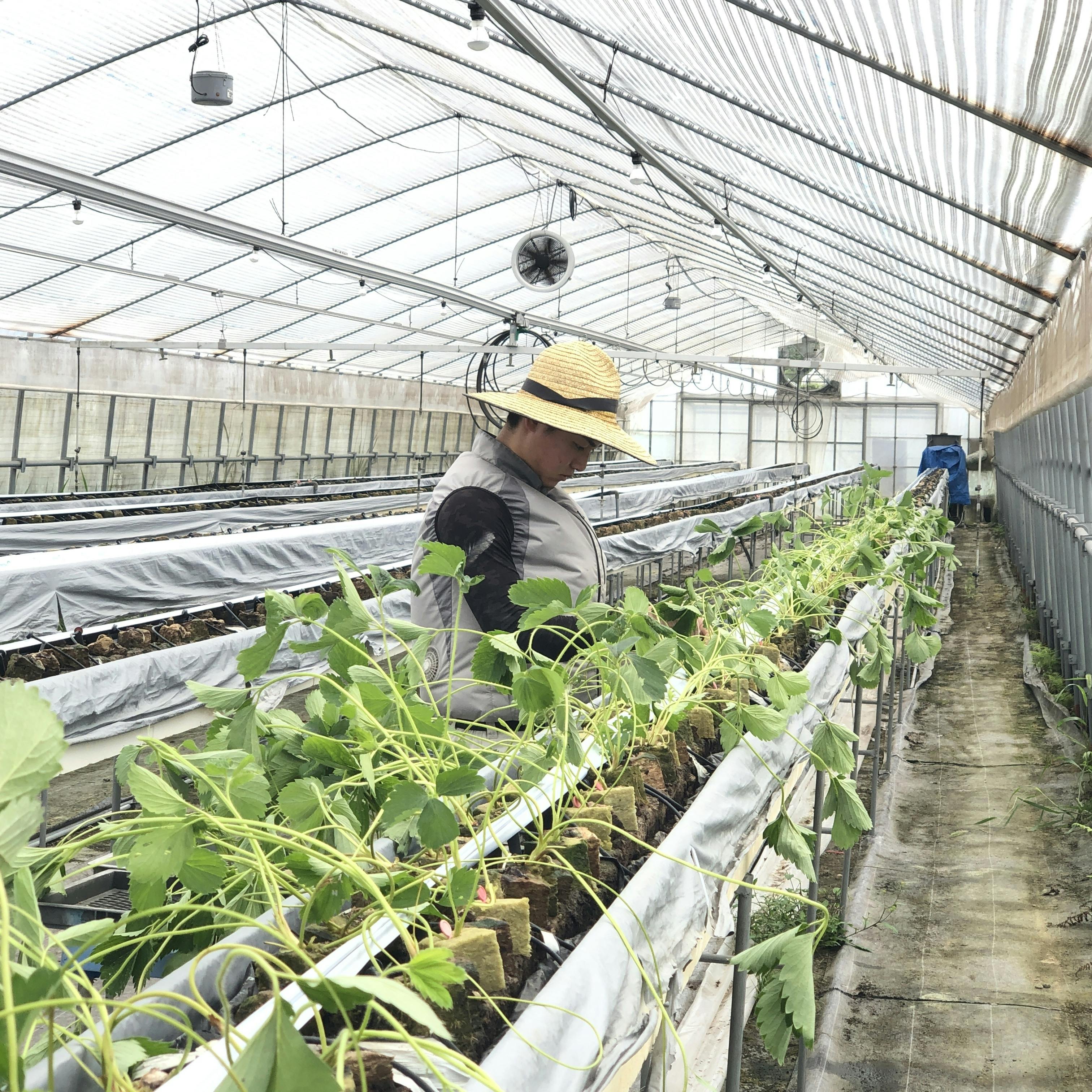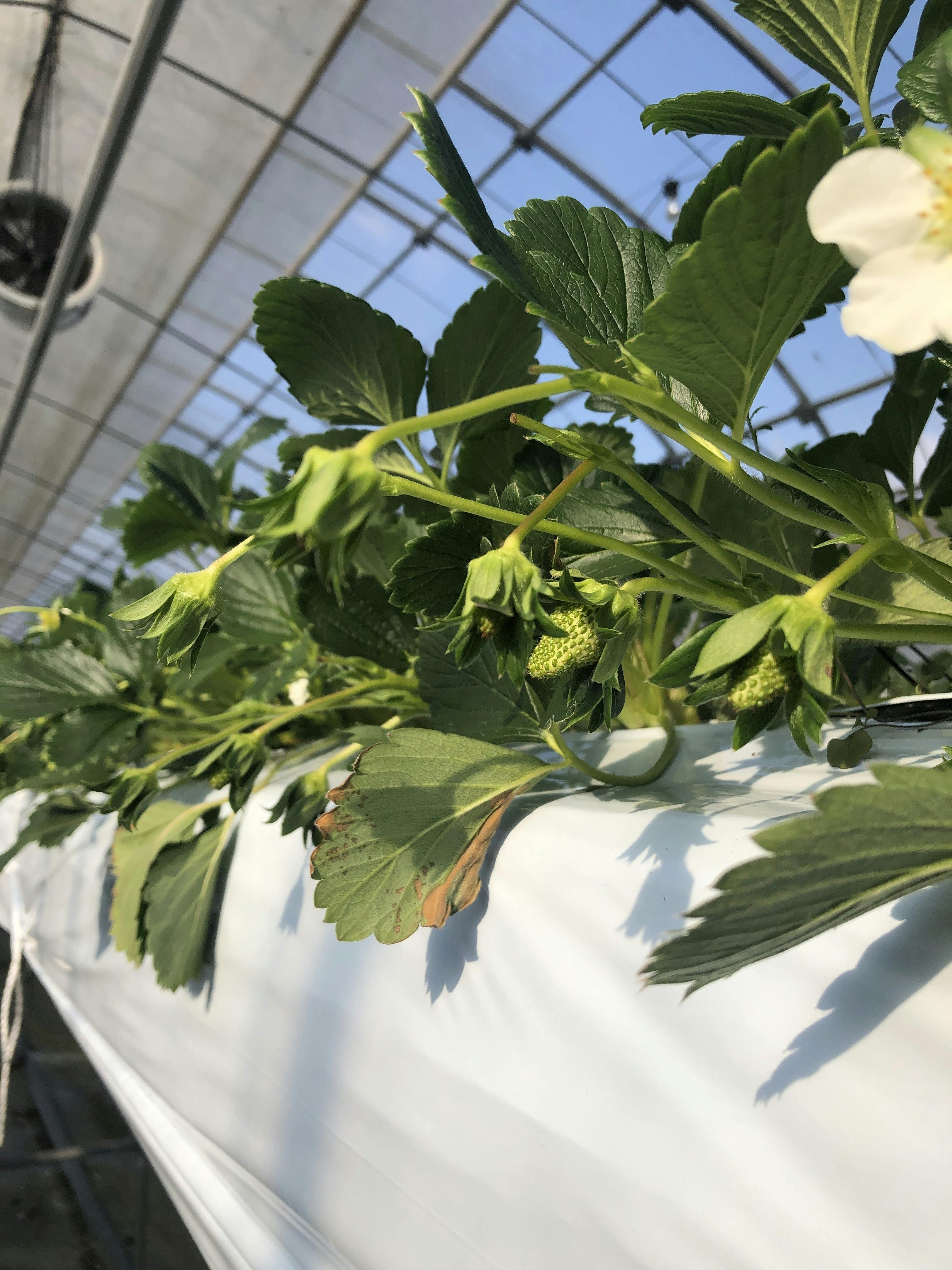 栽培方法は高設栽培で腰の高さの所に苺がぶら下がっていて取りやすく、土も使わず養液を染み込ませた培地に苗を植えるので、苺も清潔で洗わずにそのまま食べられます。土を使わないので、病害虫も少なく農薬の使用量も抑える事ができます。