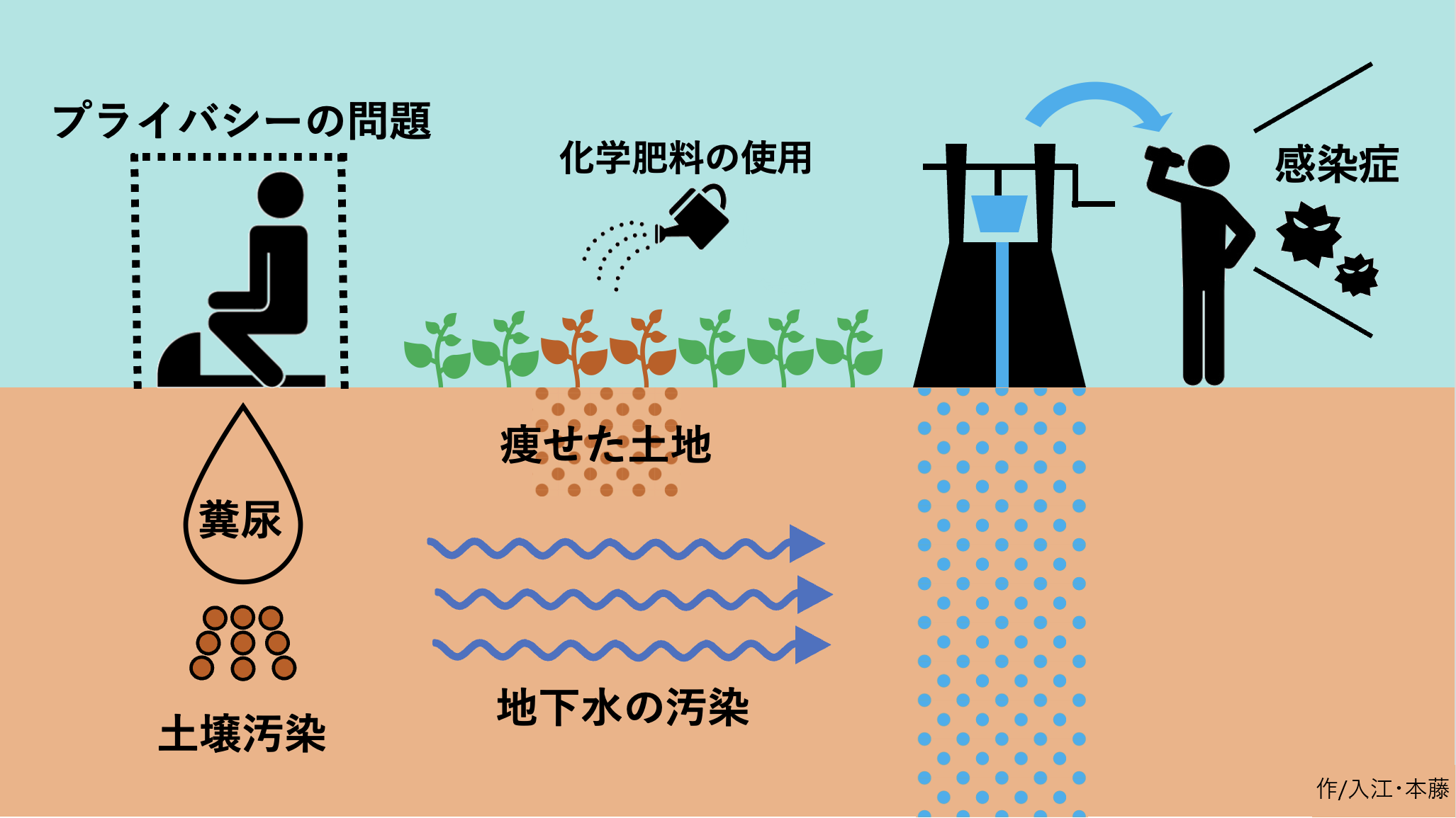 素掘りトイレは、糞尿が穴の中に溜まります。私たち人間の糞尿に含まれる物質が、その穴から周囲の土壌へ浸透し、土壌汚染を発生させます。便の細菌の死骸などの物質の他に、無機質が含まれています。適度な量の無機質なら土壌内の微生物が分解してくれますが、糞尿が集中する素堀りトイレの穴の中では分解が追いつかず、その周りの土壌や地下水・小川が無機質によって汚染されてしまいます。その結果、井戸や小川が汚染され、生態系をはじめとした環境や健康に悪影響を及ぼします。
