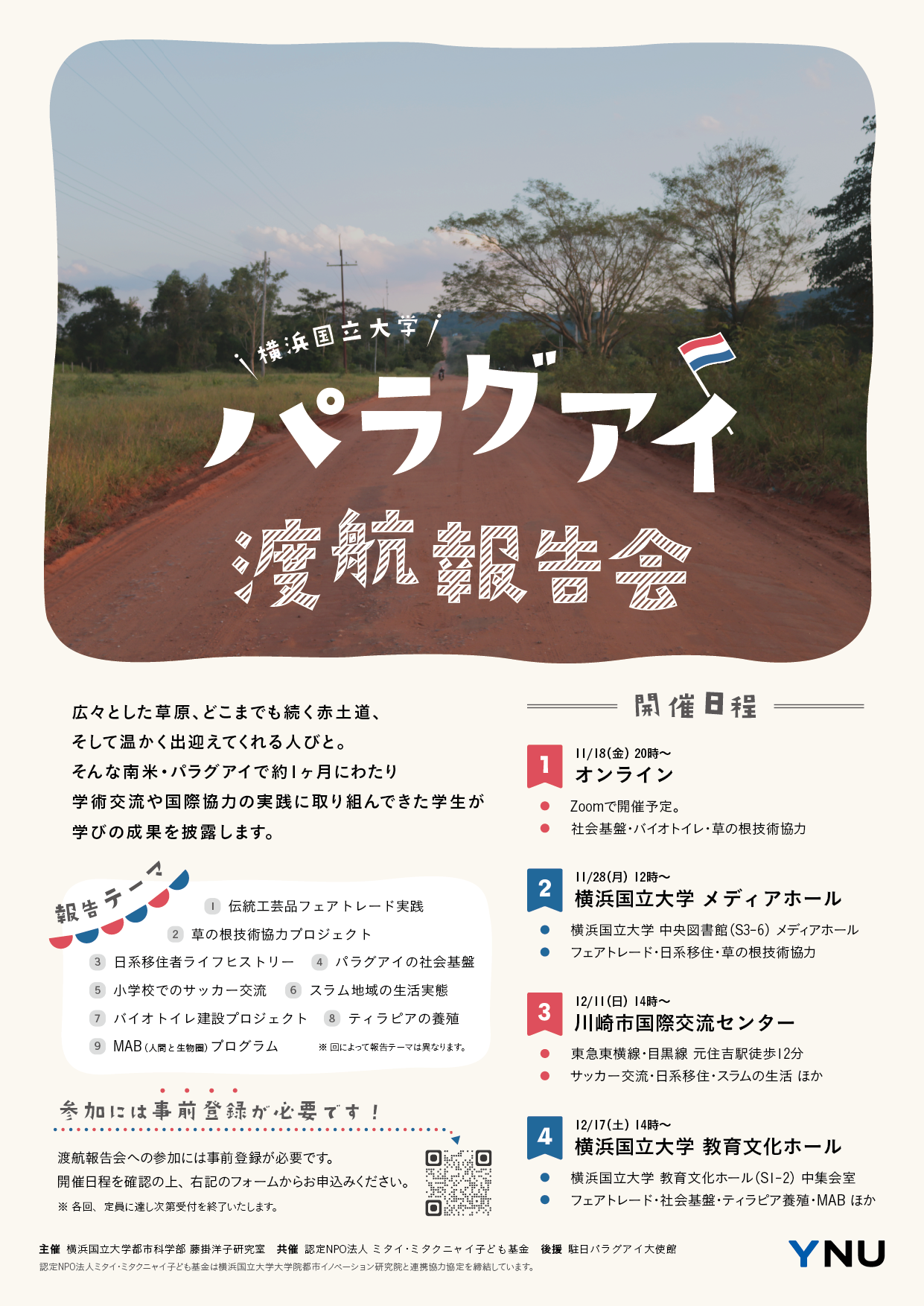 2022/11/08 08:00皆様いつも応援・ご支援ありがとうございます。都市科学部2年の杉江つくしです。この度はタイトルにもありますように、渡航報告会に関する告知をさせていただきたいと思います。私たちバイオトイレプロジェクトメンバーを含めた横浜国立大学学生17人が今夏パラグアイに渡り、様々な調査をしてまいりました。クラウドファンディングの支援者様向けの報告会は、渡航報告会とは別で実施しますが、もし興味のある方がいましたら、ぜひ渡航報告会にもご参加いかがでしょうか。最後になりますが、11月に入り、温度が急に冷え込んでまいりました。皆様体調にお気をつけください。 もっと見る
