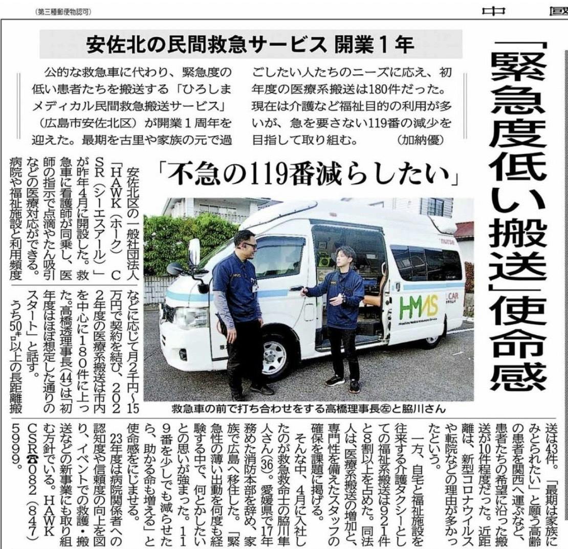 2023/05/13 16:22ご支援いただいた資金により購入出来た資機材が活躍。「多くの命に携わらせていただき約1年」経過致しました。新しい物事のスタートには「批判・応援・無関心」多くの声を感じる中全ては皆様から応援いただいた御恩を忘れずに活動出来た結果が以下となります。・令和4年11月からの広島県・広島市の5月7日までの「コロナウィルス感染者公費負担搬送委託業務」・医療搬送の民間救急必要性の認知 (写真記載の通り〜令和5年5月13日中国新聞様の記事にて〜)・今後の救急車逼迫軽減に向けてのALSOK広島綜警サービスとのタイアップ・ニノミヤグループ(医療法人社団恵正会)とのご契約・5月○日〜○日 広島Gサミット-大使館要望:首相護衛救護車列同行業務(公開不可)・2拠点病院の契約搬送(令和5年夏以降開始予定)皆様のご支援いただいた資機材により今後も社会に貢献出来るように精進して参ります。引き続き宜しくお願い申し上げます。 もっと見る