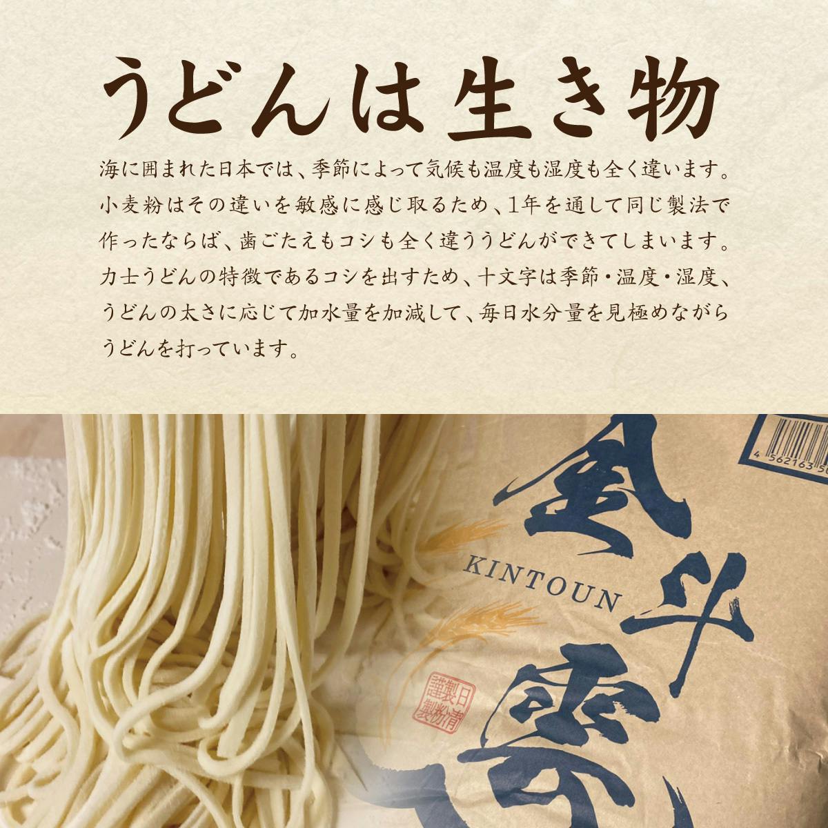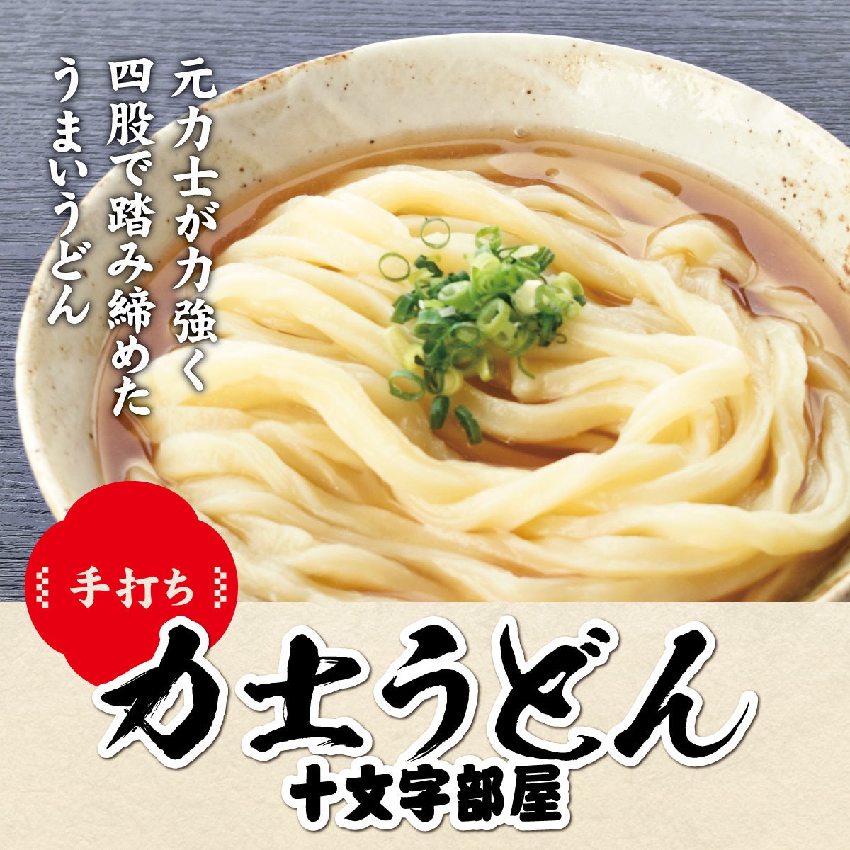 引退後ちゃんこ霧島で勤めていた十文字が、ある日「その体重でうどん踏んでみたら」と試し踏み作ったとうどんがとてもコシが強く美味しくできあがりました。