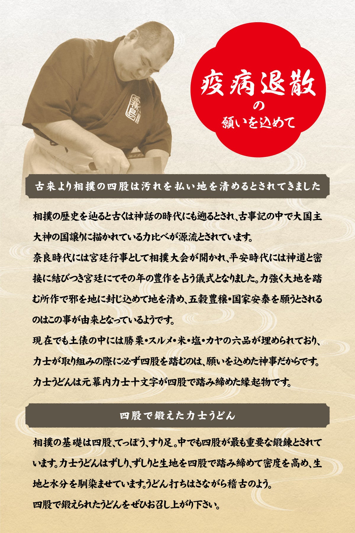 引退した力士がいつかは独立しお店を持たせてあげたいという代表の思いがあった事から『引退後の力士はうどん屋!』と始まった力士うどんの由来です。