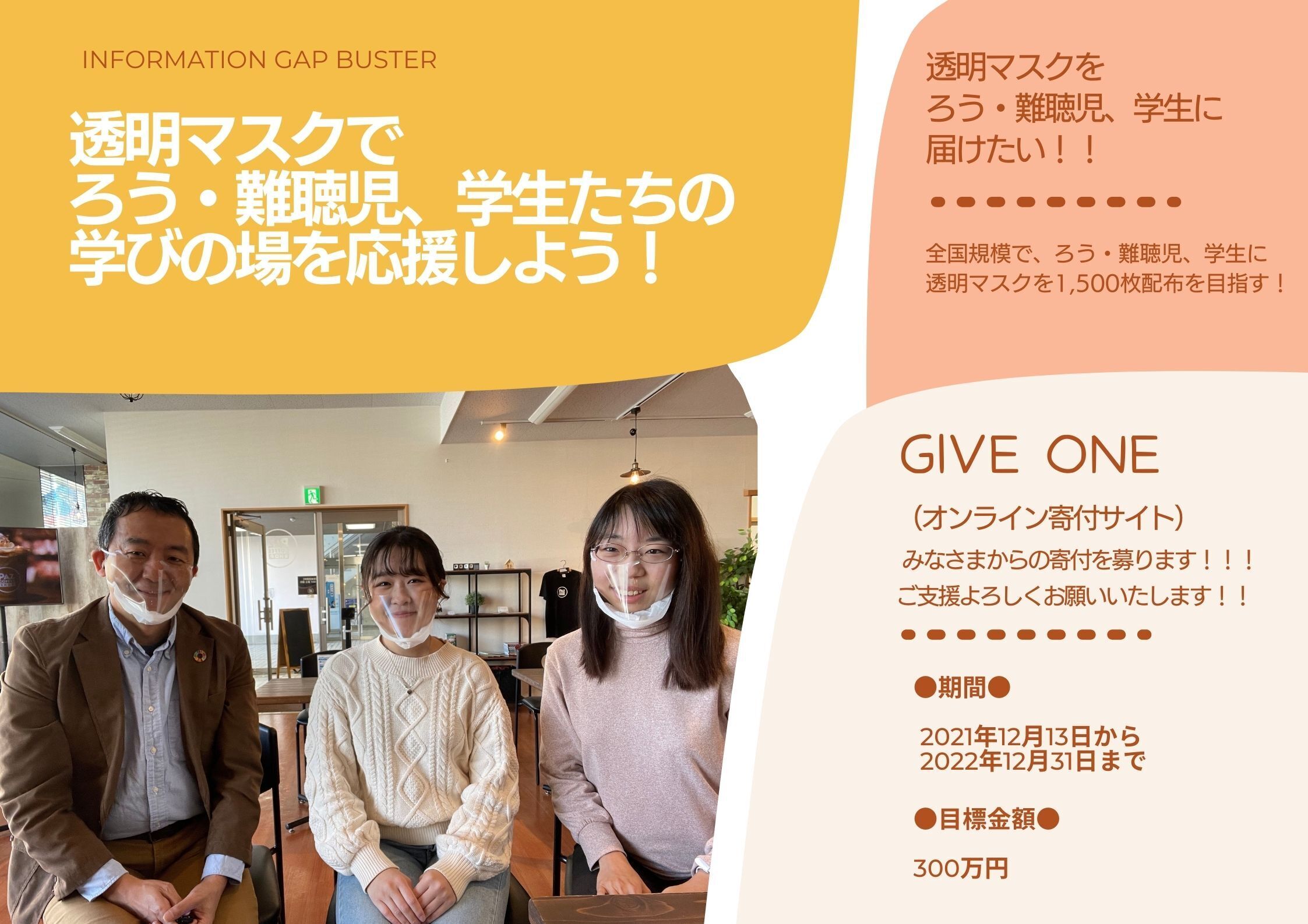 2021/12/17 08:00新プロジェクト「透明マスクでろう・難聴児・学生たちの学びの場を応援しよう! 」を立ち上げました!2021年12月13日(月)に、川端がインターン生としてお世話になっているNPO法人インフォメーションギャップバスター 透明マスク普及プロジェクトメンバーにより新プロジェクトが立ち上がりましたので、みなさまにご報告いたします。この夏に実施した当プロジェクト(透明マスク活用大作戦!)は、高等教育機関に通学している学生を対象に透明マスクを配布していました。みなさま、ありがとうございました。この度、立ち上げたプロジェクトは、透明マスク配布対象を初等中等教育機関に通学しているろう・難聴児から高等教育機関に通学している学生まで拡大します。さらに、透明マスク配布だけではなく、透明マスクを切り口に、ろう・難聴児や学生が学びやすい環境整備を目的とした発信・啓発に力を入れていきます。そこで、長期的な活動資金を募る運びとなりました。ーーー新プロジェクト概要〇プロジェクト名透明マスクでろう・難聴児・学生たちの学びの場を応援しよう!〇当プロジェクトの目的(1)教育機関における透明マスクの配布事業1,500枚(個人・団体)配布することを目標にしています。(2)教育機関における透明マスクの必要性の啓発活動各団体やグループと連携してインクルージョンを促進するためのイベントを開催したいと考えておりますので、コラボ依頼もお待ちしております。(3)ろう難聴児や学生が学びやすい環境を整えるためのネットワーク作り・支援活動私たちは、上記の活動を継続的に展開するために、支援金を募ります。〇活動の支援方法オンライン寄付サイト GiveOnehttps://giveone.net/supporter/project_display.html?project_id=20330〇活動のために必要な資金額3,000,000円〇活動資金募集期間2021年12月13日(月)~2022年12月31日(土)ろう・難聴児、学生が学びから取り残されないよう、みなさまのご支援を賜りますようよろしくお願いいたします。ーーー新プロジェクトについてご不明な点等ございましたら、下記のお問い合わせ先までご連絡ください。また、コラボ依頼などもお待ちしております。「透明マスク活用大作戦」が終わった後も活動を続けてまいりますので、今後ともご応援よろしくお願いいたします(^^)!【お問い合わせ先】clearmask-pj@infogapbuster.org(担当:石川) もっと見る