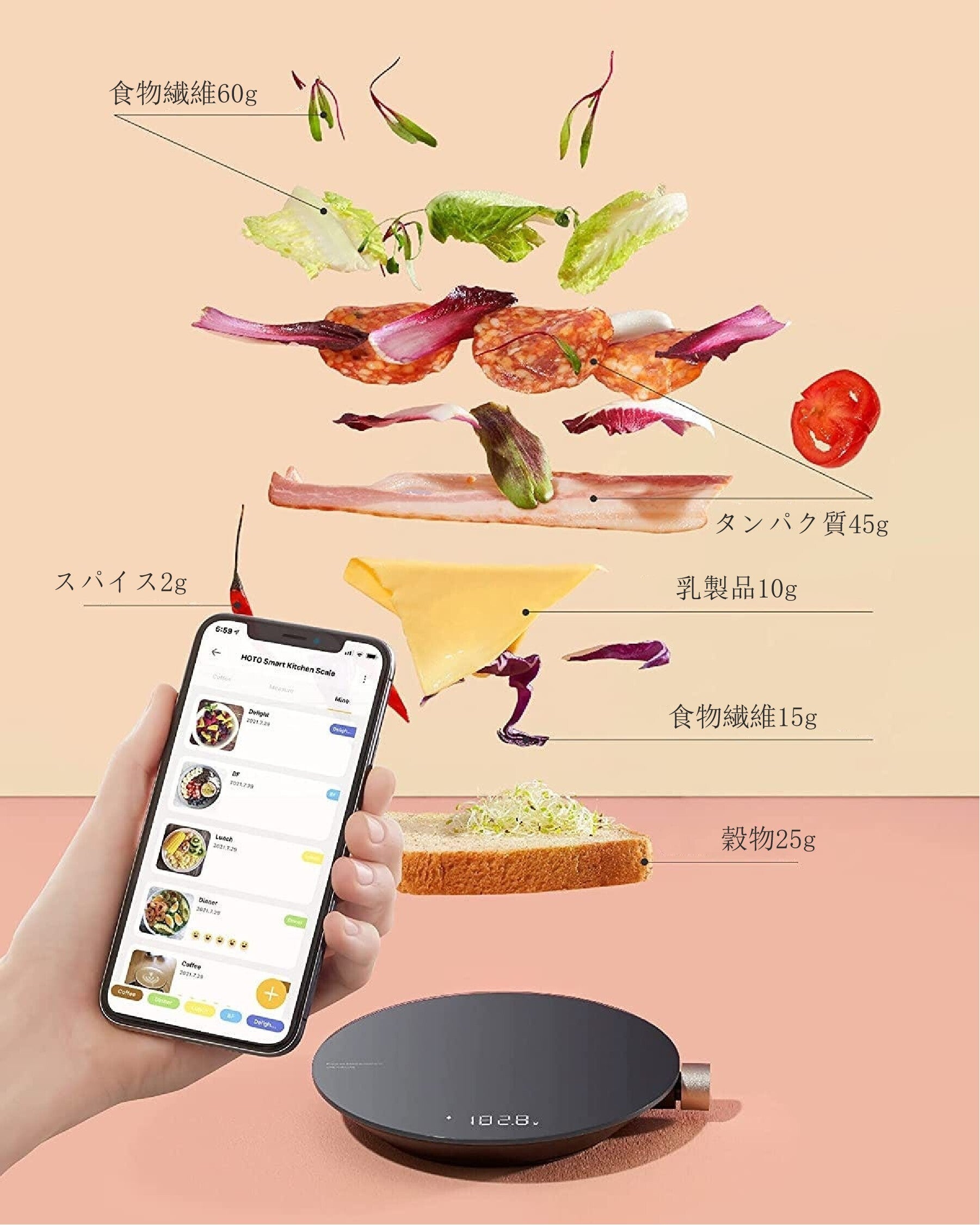 ・高精度:HOTO フードスケールは、超高精度の重量センサーを搭載しており、測定結果を一瞬で表示可能。0.1g単位で1g~3000gまでの測定が行えます。