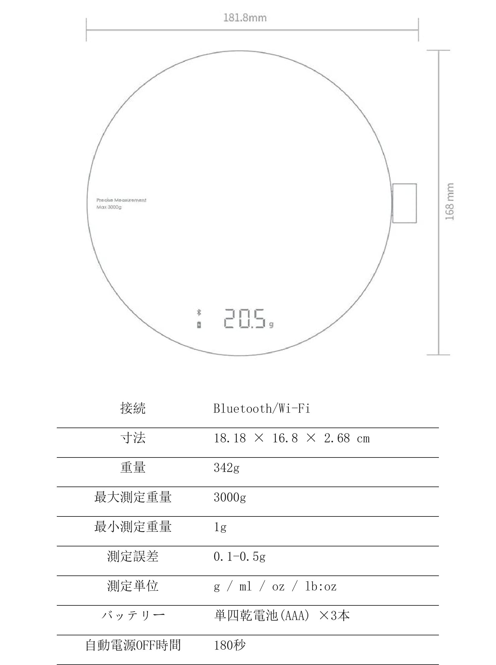 計量範囲は1g-3000g。精度0.1g単位 (1000gまで)で、リアルタイムに計量できます。