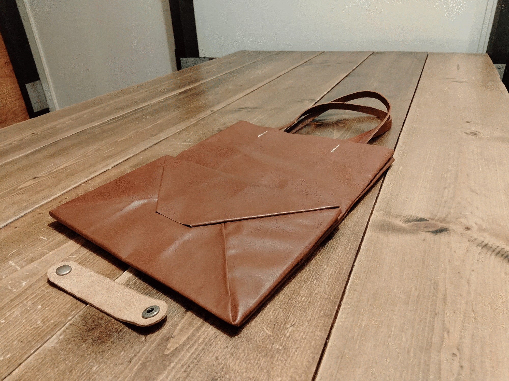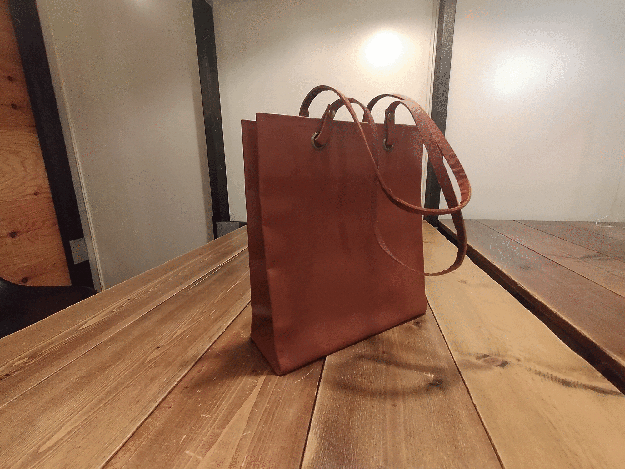 ※紙袋のような軽さを実現するため、極力縫製を減らし、一枚の革を接着加工による張り合せでバッグを軽量化しています。