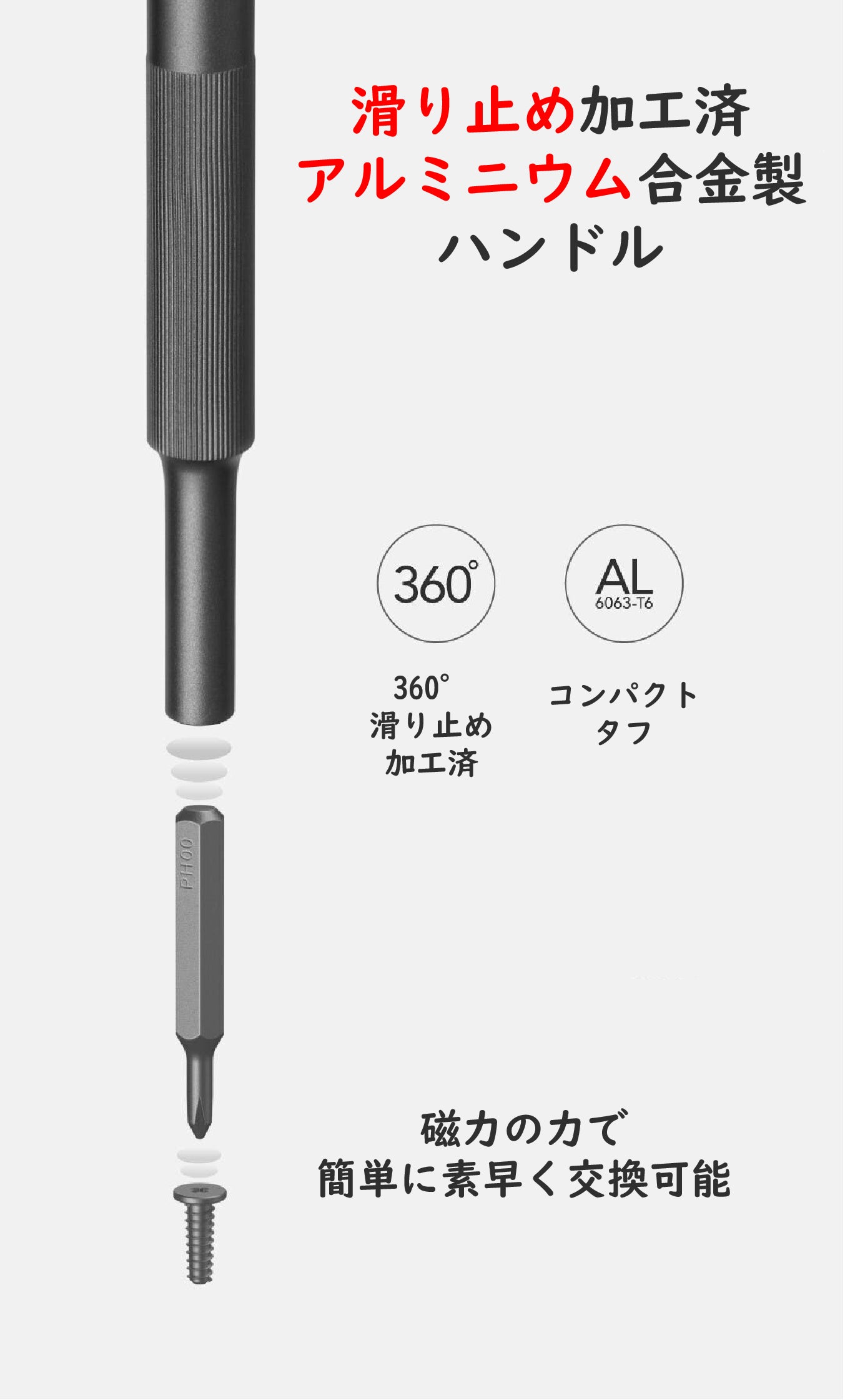 本体に内蔵された磁石によりビットやネジが引き付けられるため、ストレスフリーで使用可能です!