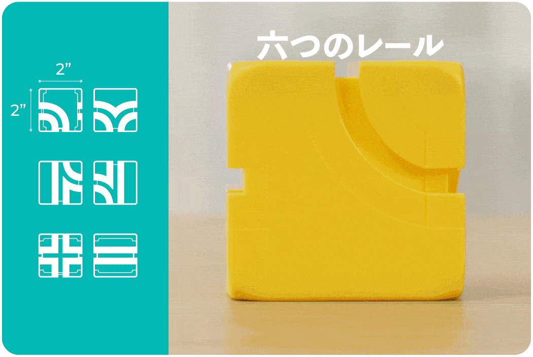 ブロックの6つの面にあるレール(直線、カーブ、交差点など)を組み合わせて、100通り以上のコースを作ることが可能。マグネットでくっつけられる簡単な仕組みで、小さなお子様も直感的に遊ぶことができます。