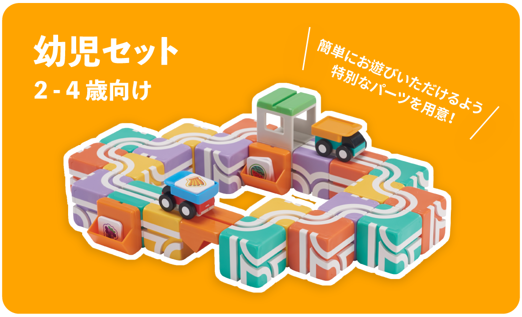 A:第一弾は、幅広い年齢で遊べる仕様になっております。第二弾は、それぞれの年齢に特化したパーツなどを準備したセットアイテムです。