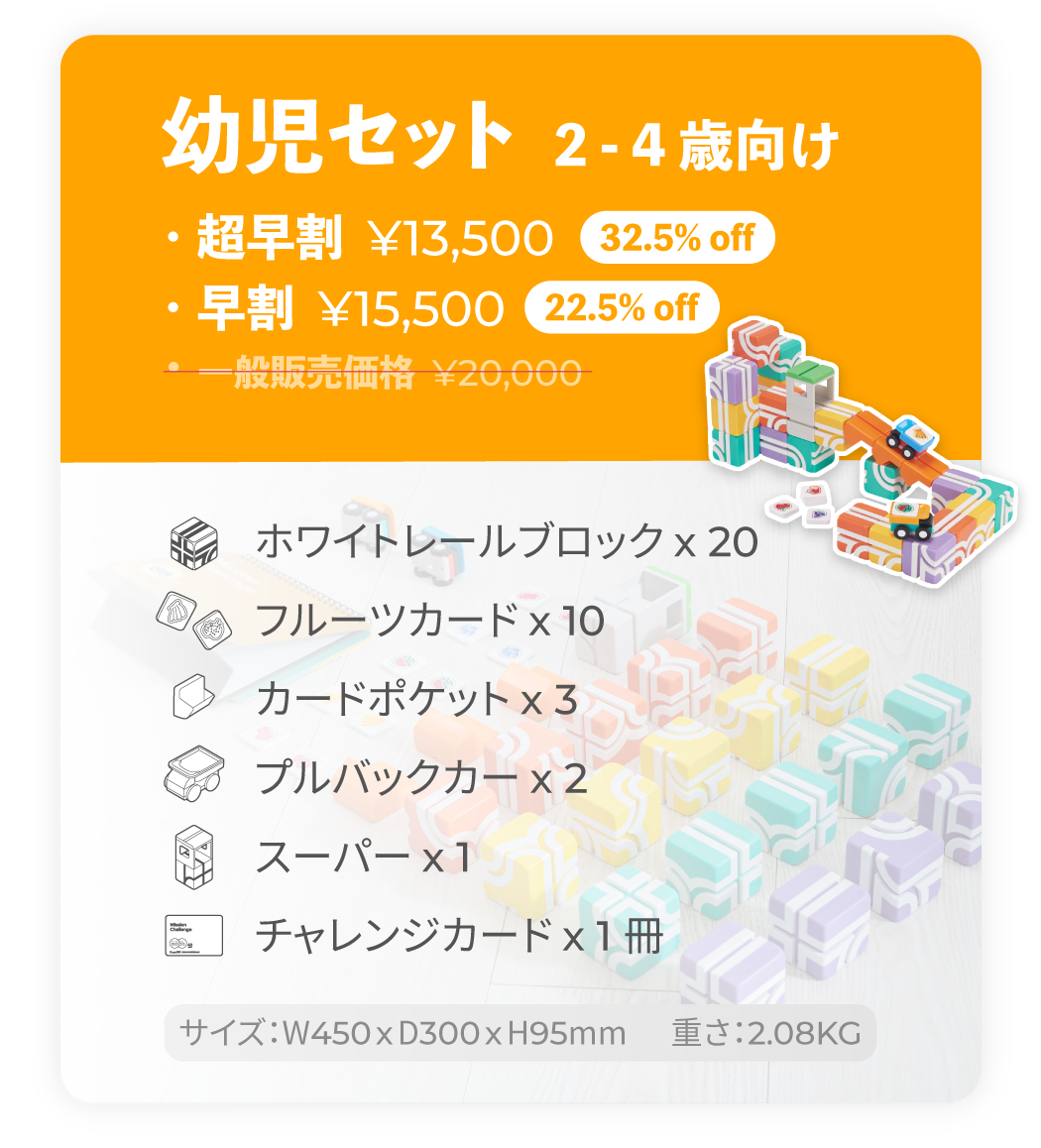 磁石を使っているので、安全。小さなお子様にも簡単に遊んでいただけます。パワフルな磁石を内蔵しているため、レイアウトが崩れてしまうこともありません。 子供セットと幼児セットのブロックの重さが違います。子供セットでは八つのブロックまで接続可能です。幼児セットなら六つのブロックまで接続可能です。