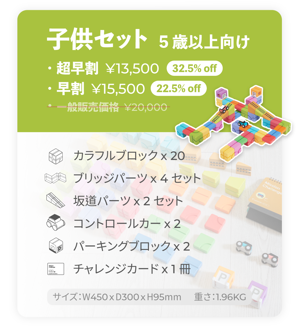色々なチャレンジカードとパーツを合わせて、ボードゲーム、積み木やパズルなどの多様な遊び方を実現し、お子様に長く遊んでいただけます。