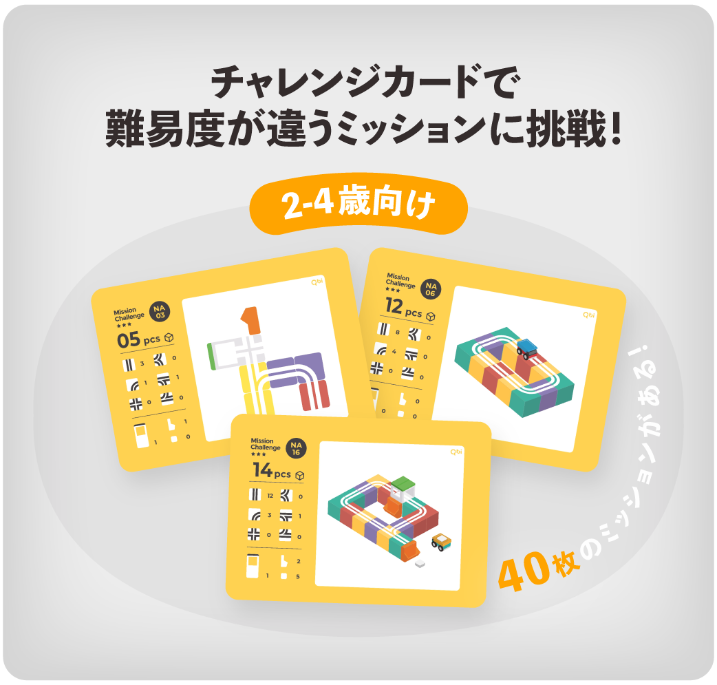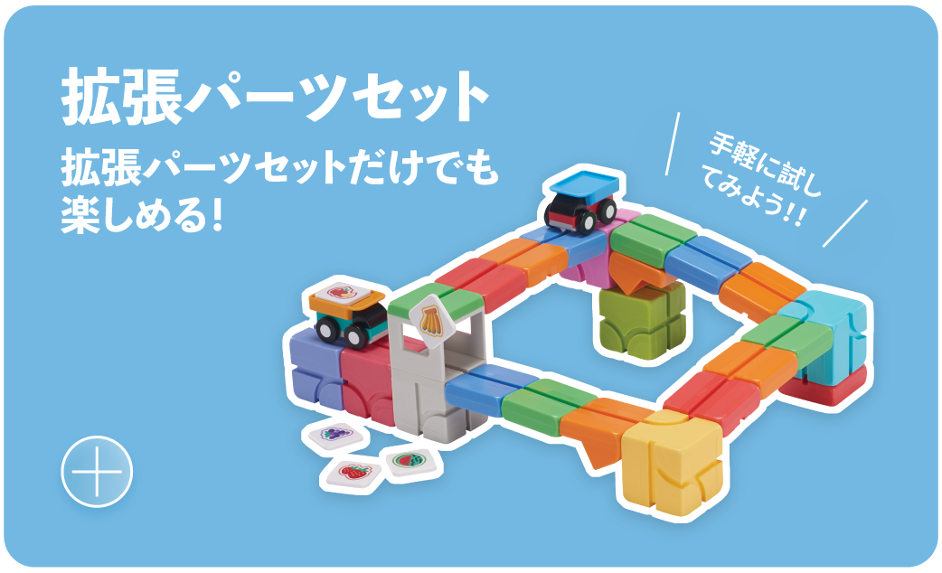 いろいろな追加パーツやチャレンジカードもあるため、年齢に応じて難易度を調整でき長く使うことができます。チャレンジカードをヒントにコースの組み立てを考えることも可能!「指定の10ピースを使って、この形を作ってみよう!」「指定の10ピースをシートに配置して、ゴールを目指そう!」などのミッションに楽しく取り組み、自然と立体の図形のセンスや論理的思考力を育むことができます。