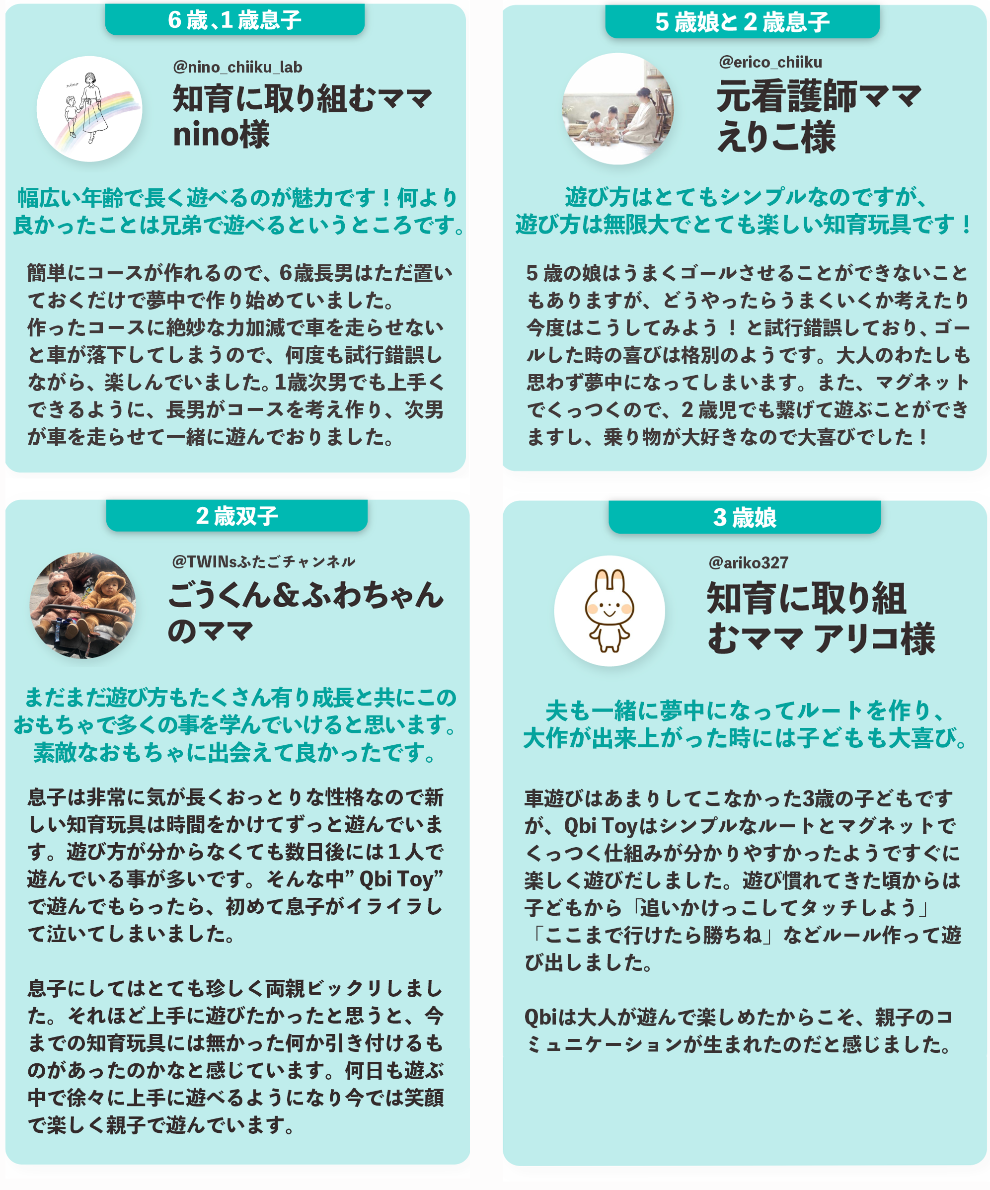 製品開発のプロセスにおいて、3歳~68歳の方に実際に遊んでいただくテストを実施。幅広い世代において高い満足度を得ることができました。難しいコースを挑戦することで、 きっと大人もQbiの魅力にハマるはず。