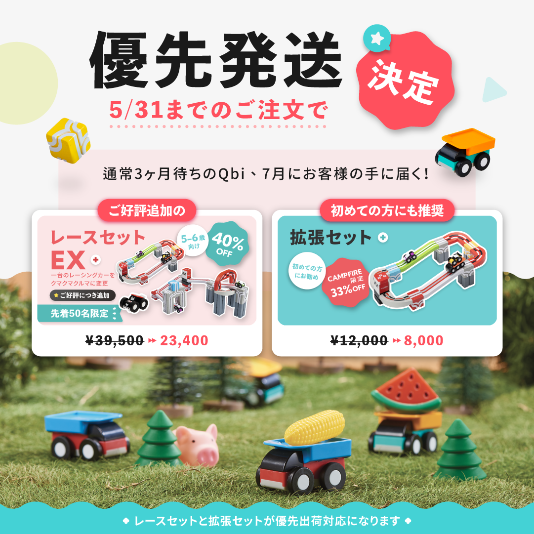 2023/05/22 15:00ご支援いただいた皆様へ日本の皆様から熱い応援で、ついに、 Qbiは450万円の支援額を突破しました!今までQbiを支援いただいた方感謝の気持ちを伝えるよう、前例なしの優先発送をお決まりました!今回のプロジェクトの商品発送スケジュールは8月より支援者の手にお届け予定ですが、5/31 前に、今回の新品レースセットや初めての方にもおすすめの拡張セットをご支援いただければ、7月下旬に支援者の手にお届けします!まだ支援をご検討している方は、ぜひこのチャンスをお見逃しなく! もっと見る