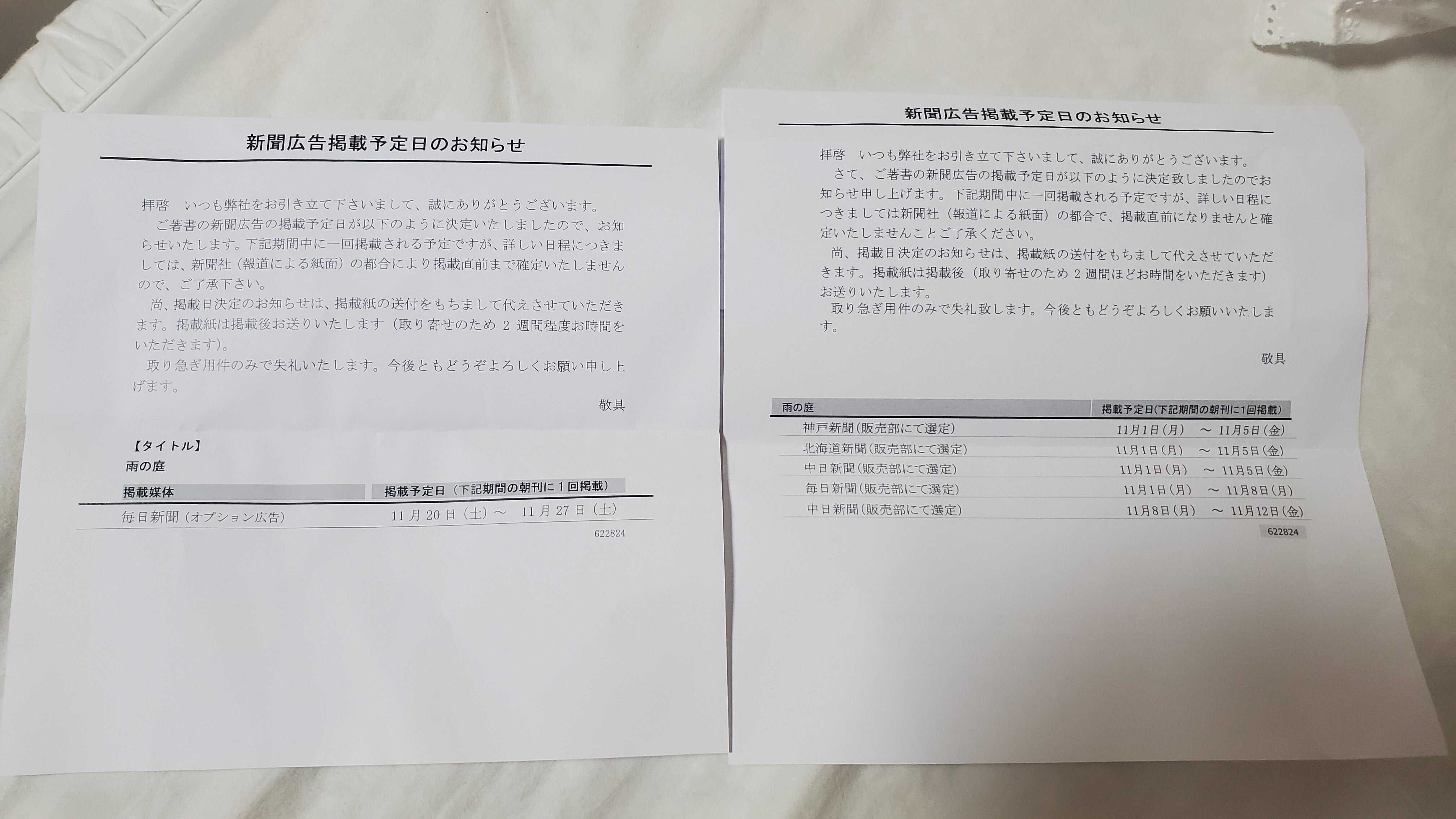 つまり、『雨の庭』の広告を新聞(しかも全国紙)で載せてもらえるということです!!!