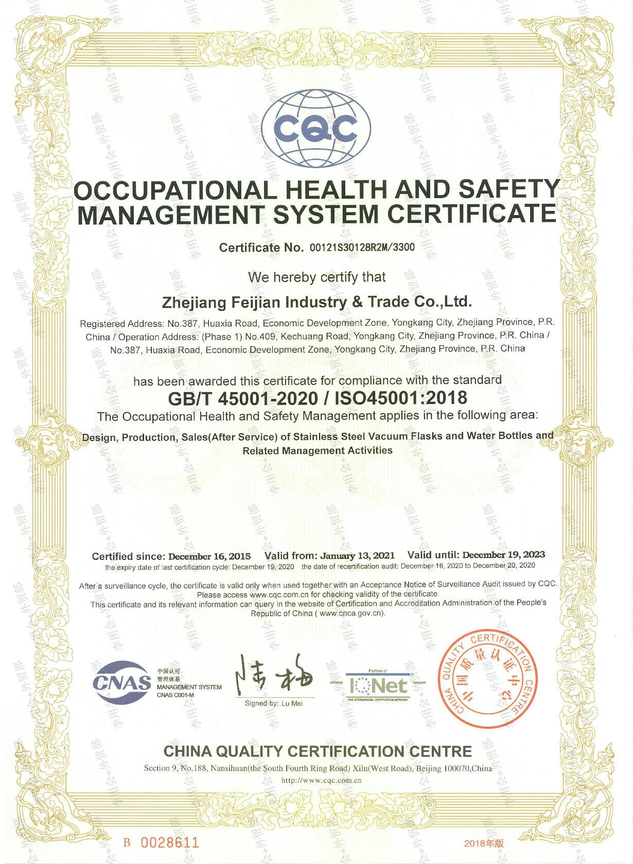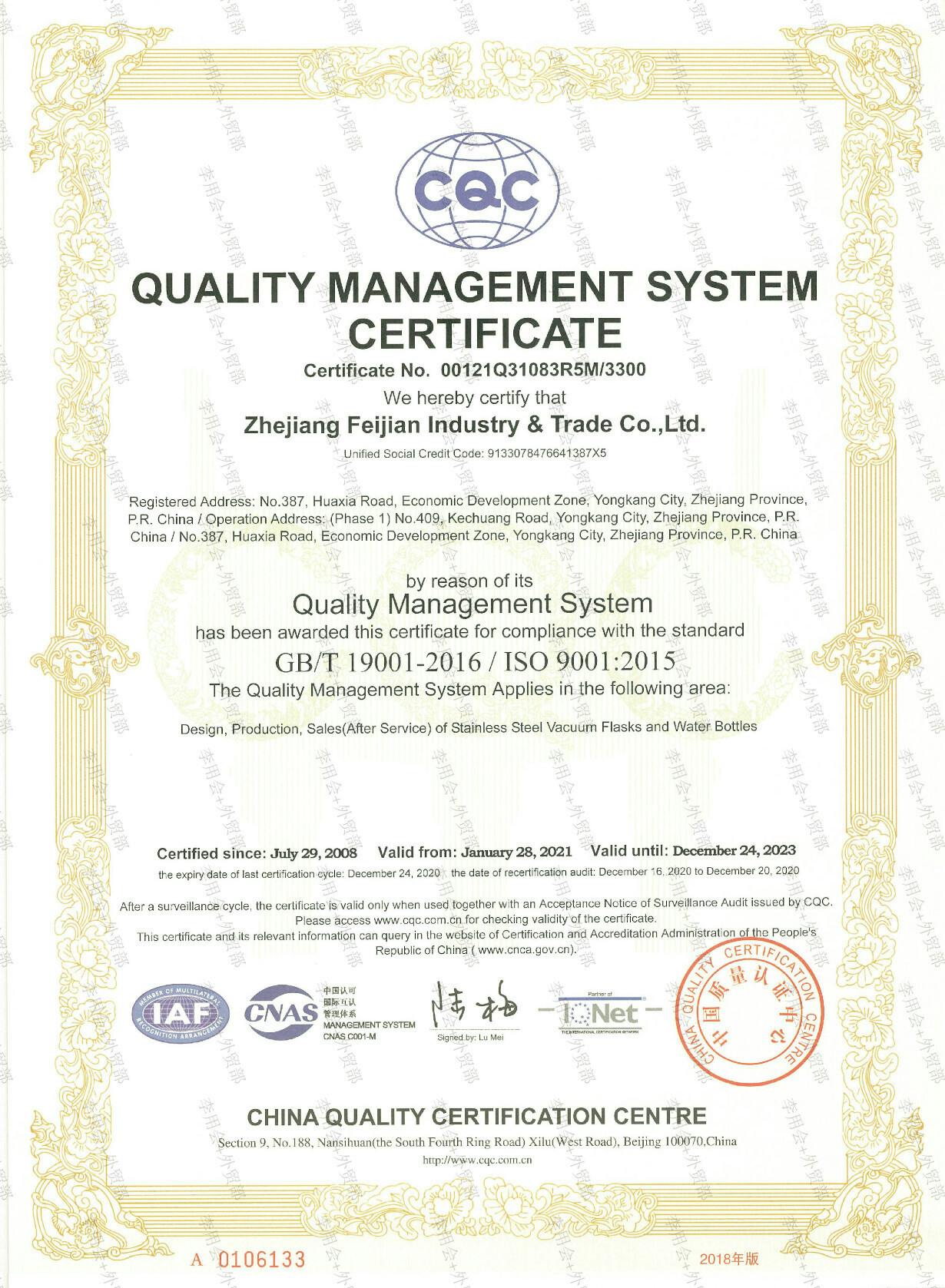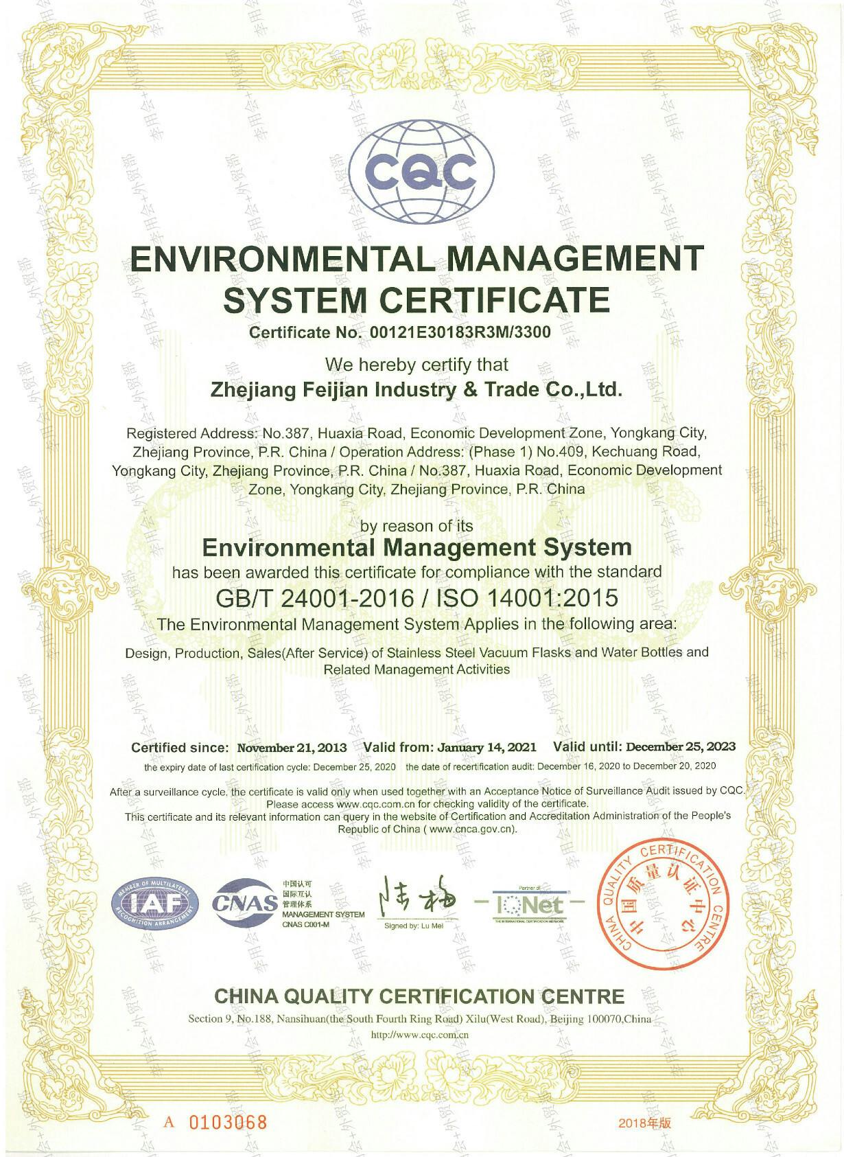 Feijian(フェイジャン)社は、国際標準化機構 (ISO) による品質マネジメントシステム(ISO 9001:2015)、環境マネジメントシステム(ISO 14001:2015)の「認証を取得」しています。