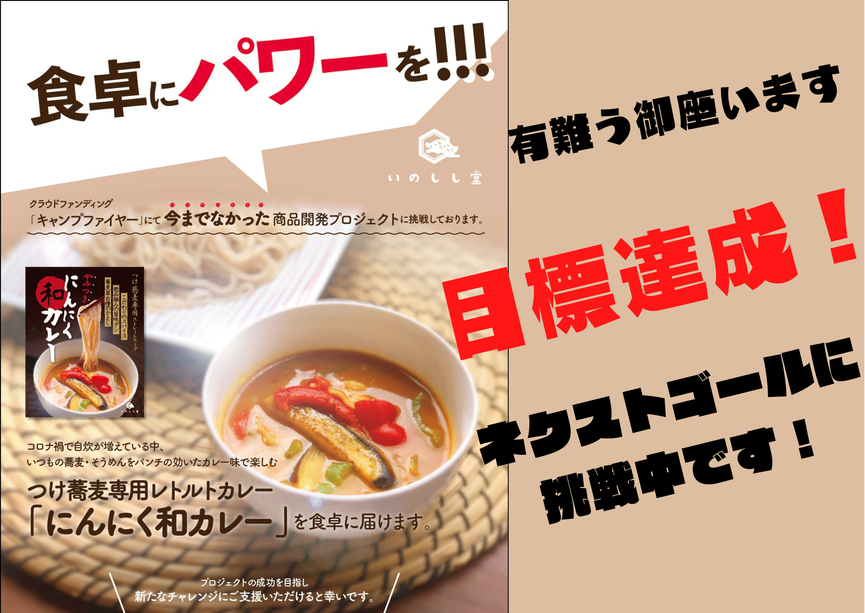 2021/10/16 17:09おかげ様で、目標を達成することが出来ました!ご支援頂きまして本当にありがとうございました!!心よりお礼申し上げます。本来であればすぐにでも直接お礼を申し上げたいところなのですが、CAMPFIREのシステム上、掲載終了まで個人情報を把握することが出来ない状況でございます。掲載終了後、改めて感謝の気持ちをお伝えさせて下さい!皆様のお力添えにより、目標額である30万円を達成することが出来ました。残りの22日は、ネクストゴールの70万円に挑戦させて頂きたいと思います。ネクストゴールは「にんにく和カレー」総製作費となります。掲載終了まで大きな目標へ向かって、さらに走り続けていきたいと思います。いのしし堂を、引き続きどうぞよろしくお願い致します。 もっと見る