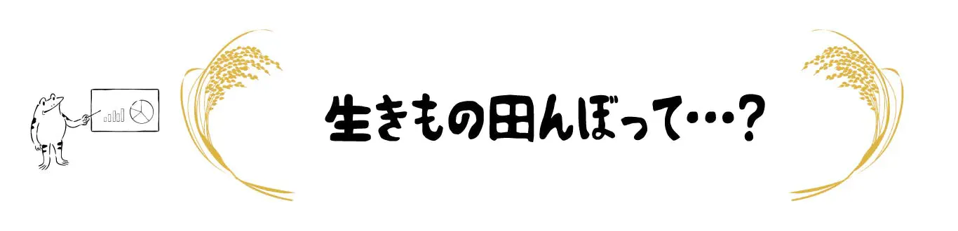 「生きもの田んぼ」とは、農薬・化学肥料・除草剤を使わない農法で、動物性の肥料を使わず、田んぼで穫れたものを田んぼに還す意味も込めて、米ぬか、もみ殻などを微生物で発酵した肥料を使用した田んぼです。