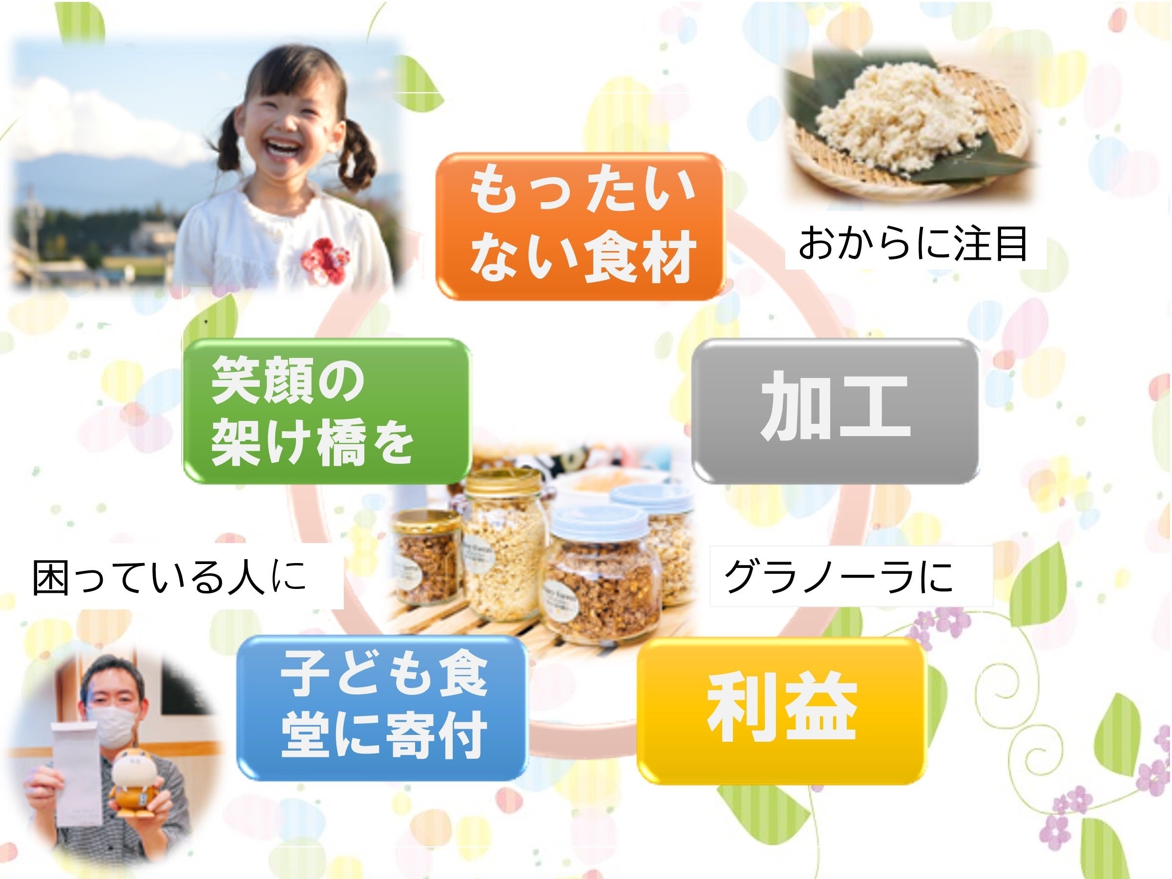 私はもったいない食材おからを加工し雪花菜のグラノーラを販売、そこで生まれた収益を生活に困っている人に届けることができたら、持続可能な社会に一歩近づくと考え子ども食堂に寄付をしています。