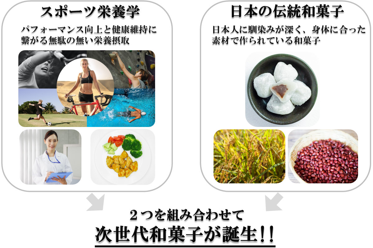 日本の伝統の和菓子は身体にやさしい天然素材中心で、さらに低脂質の優れたエネルギー源でもあります。私たちはその和菓子の高いポテンシャルに着目し、スポーツ栄養学に基づいたアプローチで和菓子の素材を刷新しました。