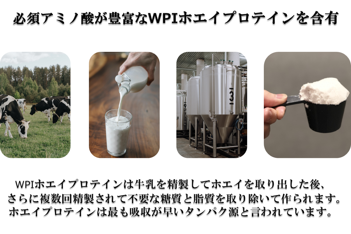 WPIとはホエイプロテインアイソレートの略で、牛乳を精製して取り出した乳清(ホエイ)をさらに精製して乳糖と乳脂肪を極力取り除いたものを言います。