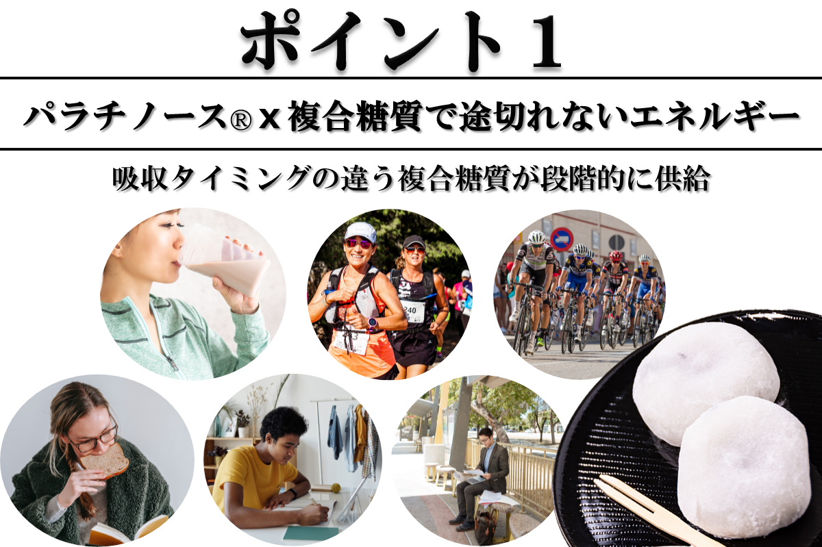 ナガモチは、パラチノースⓇx複合糖質で途切れないエネルギーが特徴です。