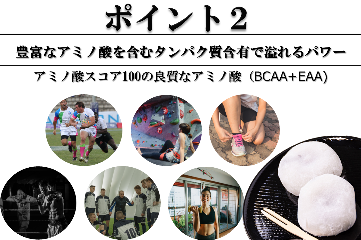 ナガモチはスポーツのパフォーマンスアップと健康維持に欠かせない牛乳由来のホエイプロテインをプラスしています。このホエイプロテインは20種類のアミノ酸から構成され、9種類の必須アミノ酸EAA※1の中でもBCAA※2を多く含み、アミノ酸スコアは最高値の100※3です。