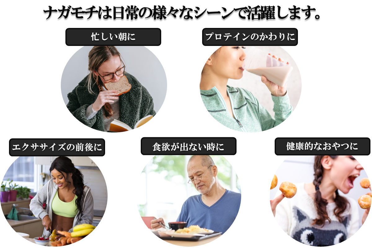 ナガモチはスポーツ等の人間の活動のパフォーマンスアップと健康維持を目的に作られています。食べた後に糖質とタンパク質が素早くエネルギーとして使われるようにするために必要のない脂質は極限までカットしています。