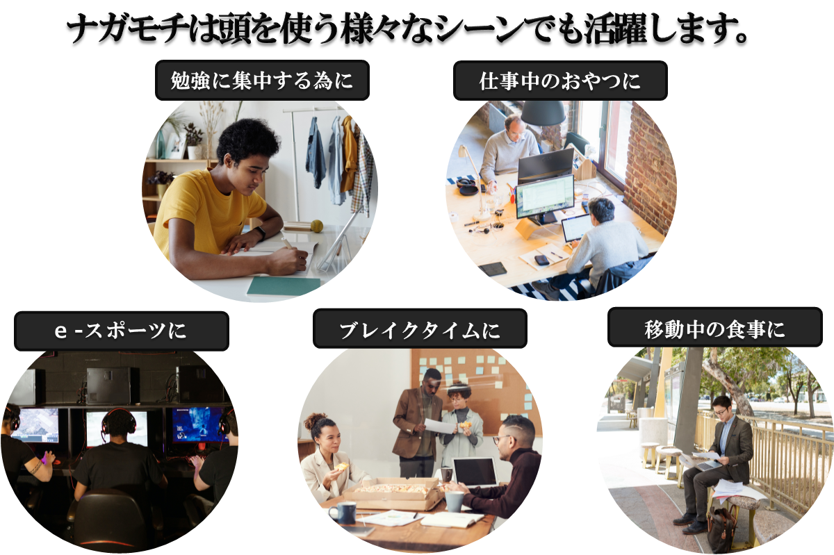 ナガモチは勉強や仕事の合間、ブレイクタイムや移動中などのシーンで活躍します。調理のいらない食べやすい和菓子なので、大事な書類、電子端末に液体をこぼす心配もなく、跡片付けが面倒な洗い物も出ません。