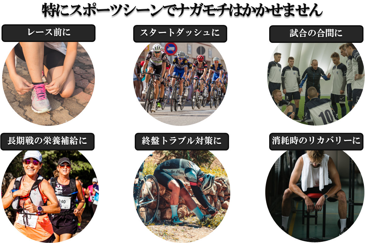 ナガモチは試合の前の計画的なカーボカップからレース前のエネルギー補給、レース中や試合の合間のエネルギーチャージ、長期戦の栄養補給、終盤のトラブル回避、レース後のリカバリーなど幅広いシーンで活躍します。ナガモチ1個の大きさは約70gなので、携帯補給食としてもぴったりです。
