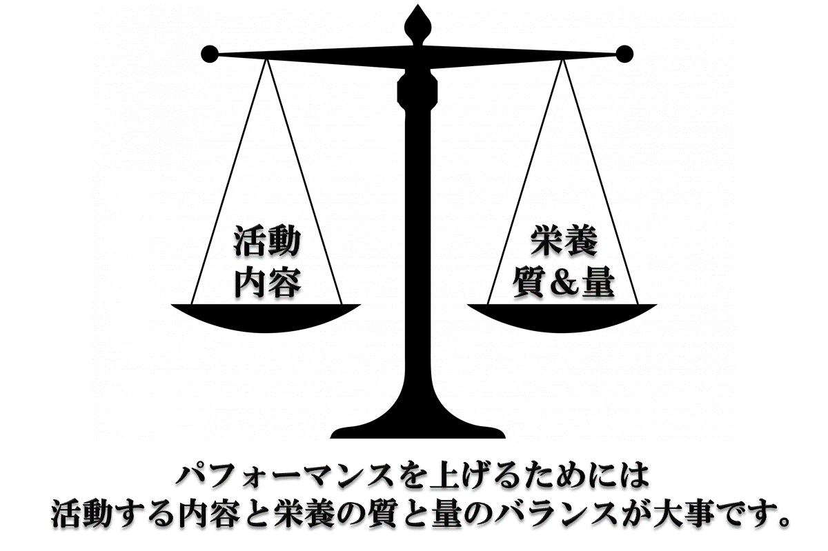 運動する事ばかりに目が行きがちですが、それ以上に「食事」=「栄養補給」が大切です。栄養補給は特に運動の前後にしっかり行う事が重要になります。理由としては運動時にはたくさんのエネルギーを消費しますが、運動時のパフォーマンスアップ、パワー&エネルギーの継続、集中力を保つ事と、運動後に消耗した身体のリカバリーをしっかり行う事も翌日以降に疲れを残さないため大事な要素です。