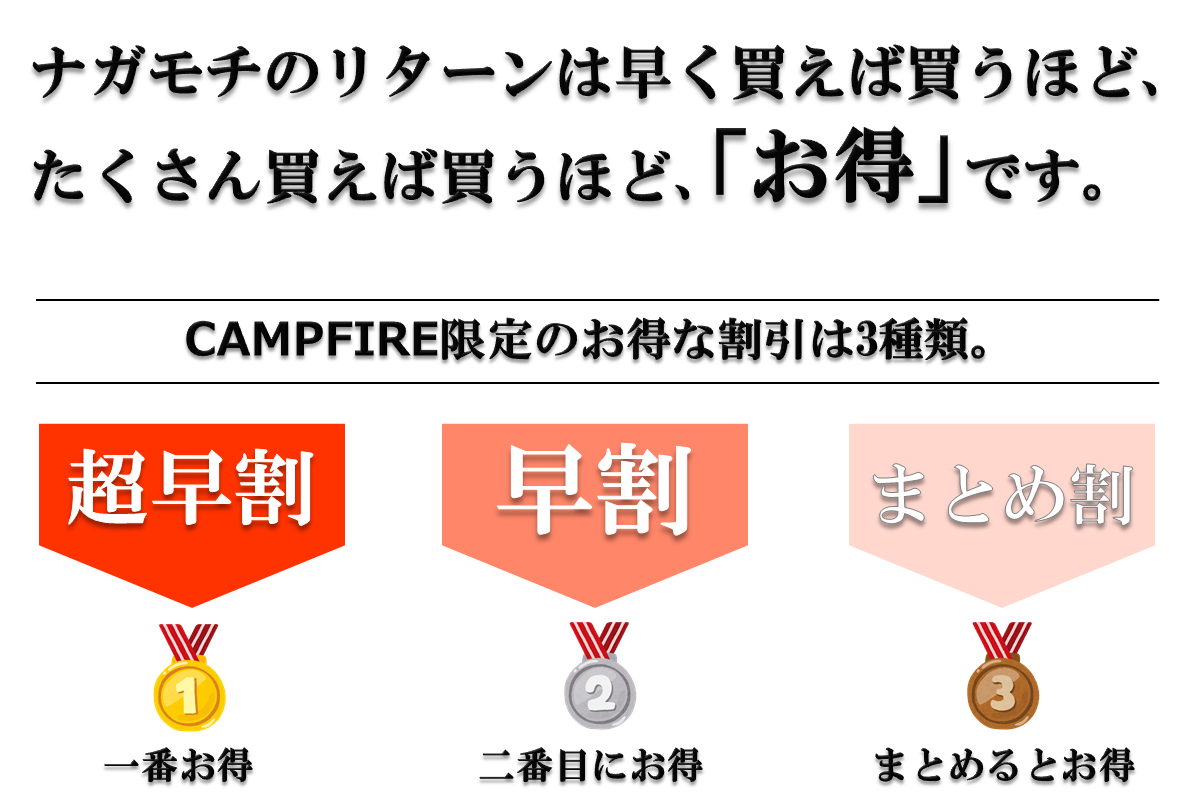 リターン内容は、一般販売の前に一足早くCAMPFIREの支援者だけにナガモチを販売します。