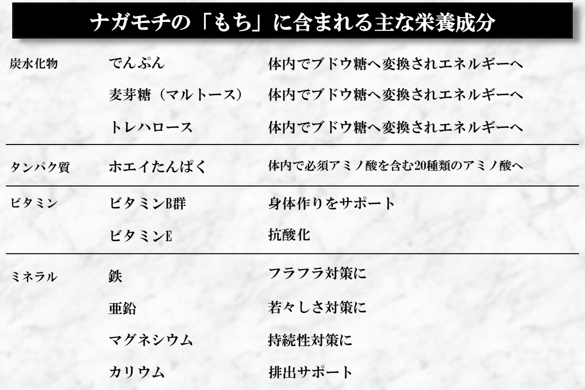 ナガモチの「オリジナルもち」を食べると、もちに含まれるでんぷん、麦芽糖、トレハロースは食べた後に段階的に分解されてブドウ糖となり吸収されます。ホエイたんぱくもアミノ酸へ分解され、その他のビタミンやミネラルと一緒に吸収されることでエネルギーになります。 さらにこのオリジナルのもちには持久系ミネラルのマグネシウムやカリウムも含まれていることもうれしいポイントです。
