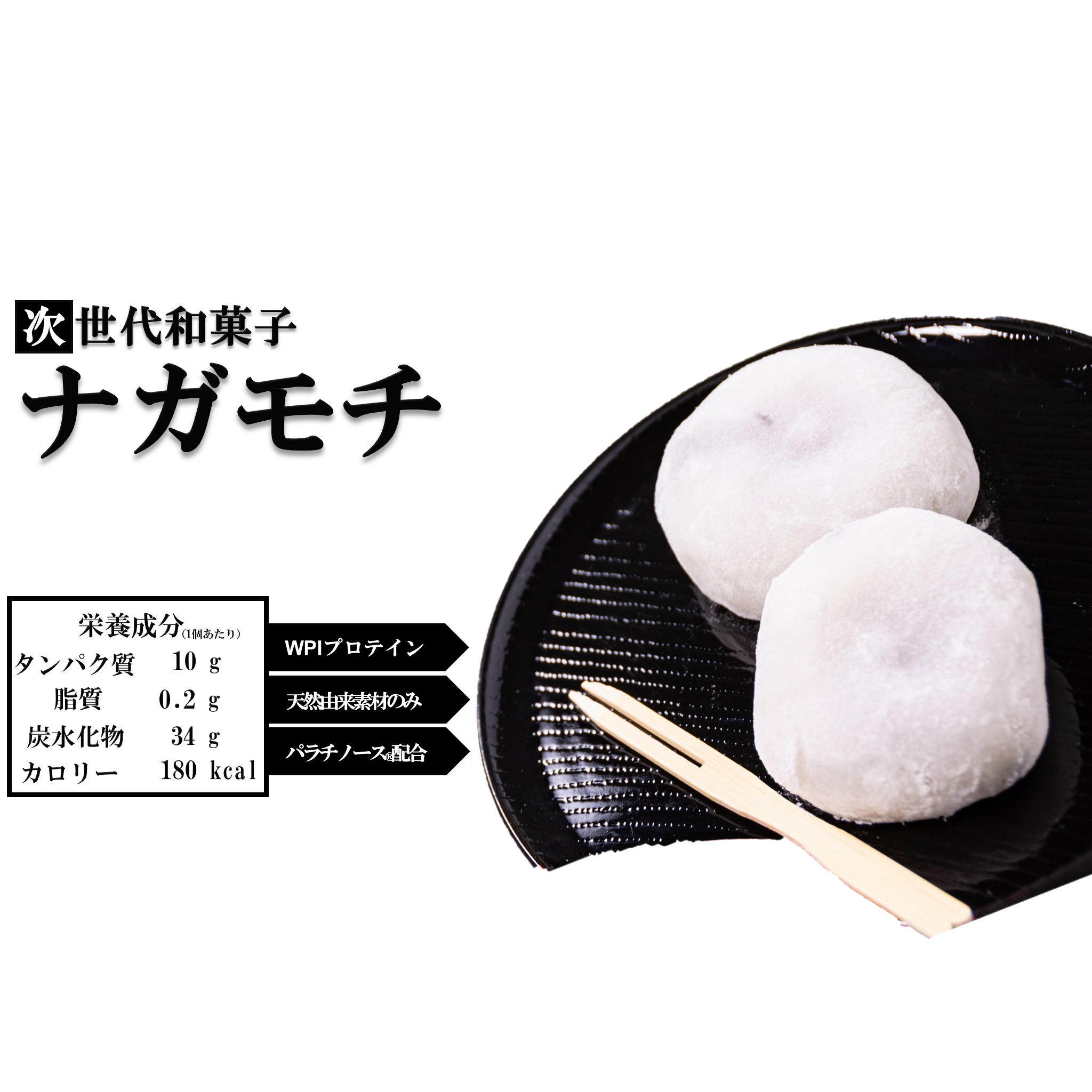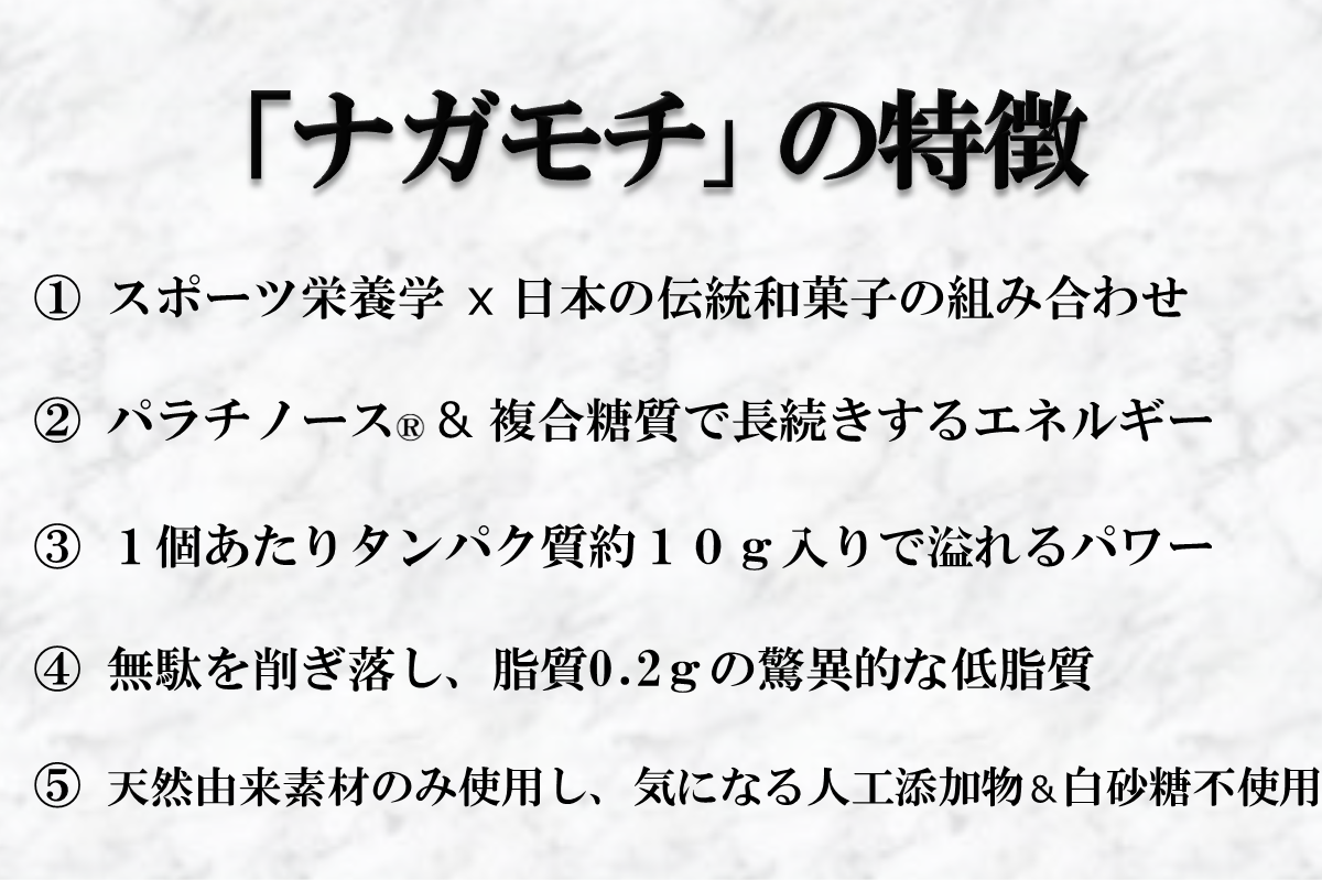 「ナガモチ」は「スポーツ栄養学」と「日本の伝統菓子でもある和菓子」の優れた部分を組み合わせて作った次世代の和菓子です。