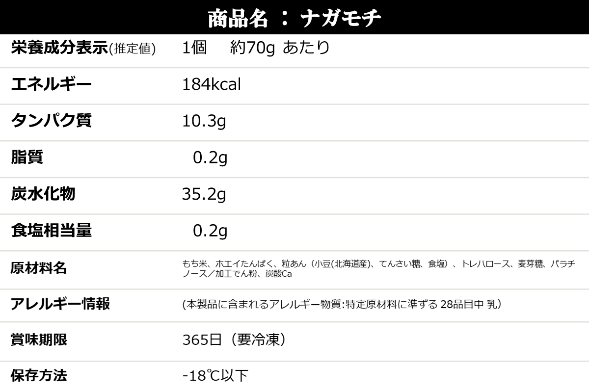ナガモチは普通の和菓子とは違い、タンパク質が豊富に含まれています。