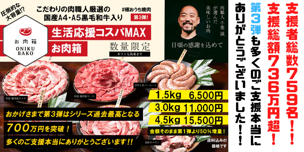 第1弾「#極おうち焼肉~お店の味を大公開!仕込み方動画と食べ方ガイドブック付き国産A4・A5黒毛和牛入り焼肉セットお肉箱Ⓡ」、第2弾「#極おうち焼肉~国産A4・A5黒毛和牛入り記憶に残る体験型お肉箱Ⓡ」、第3弾「#極おうち焼肉~国産A4・A5黒毛和牛入り生活応援コスパMAXお肉箱Ⓡ」では、延べ1900人以上の支援者様と当初の目標金額を大きく上回る19,000,000円を超える支援金と心のこもった沢山の温かいメッセージを賜り、スタッフ一同この場を借りまして改めて心から感謝申し上げます。本当に本当にありがとうございました。