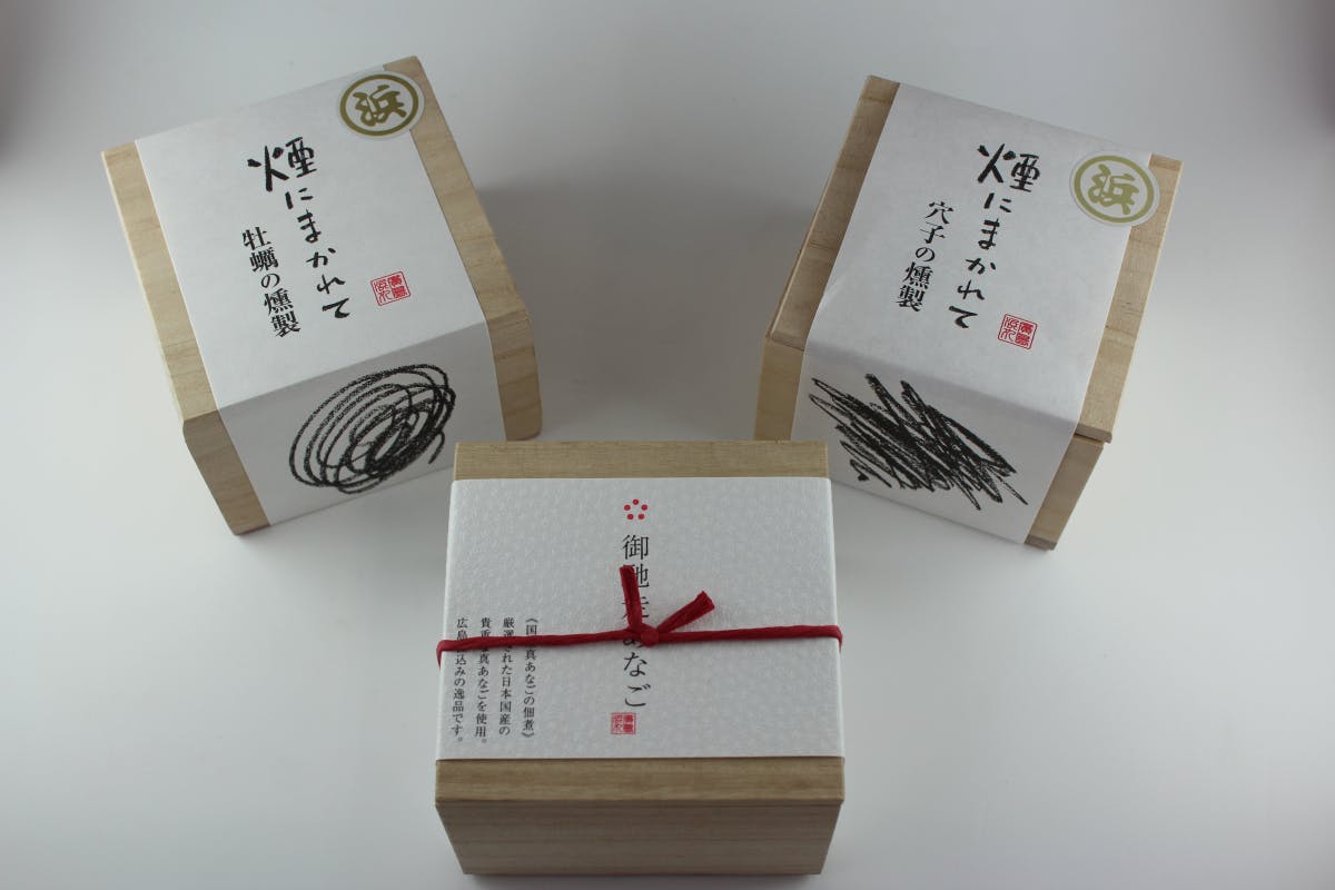 当社自身の穴子と、牡蠣の燻製『煙にまかれて』2種類と同じ桐箱に入れてお届けする国産真穴子の山椒煮『ご馳走あなご』3点セットです。