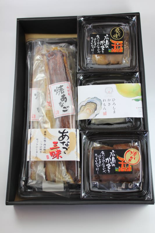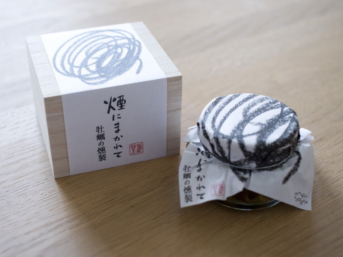 (内容) 国産真穴子の燻製 100g、地御前産牡蠣の燻製 90g、国産真穴子の山椒煮 100g