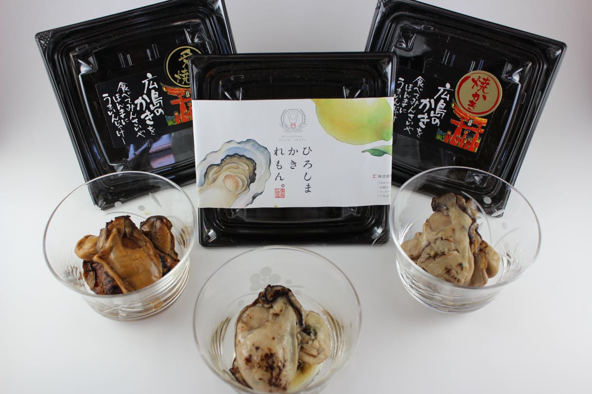 地御前牡蠣を原料に手作りで作り上げた自慢のたれを使った『焼き牡蠣』素材の味を楽しめる『炙り牡蠣』広島レモンでさっぱり仕上げた『ひろしまかきれもん』の3種類のセットです。