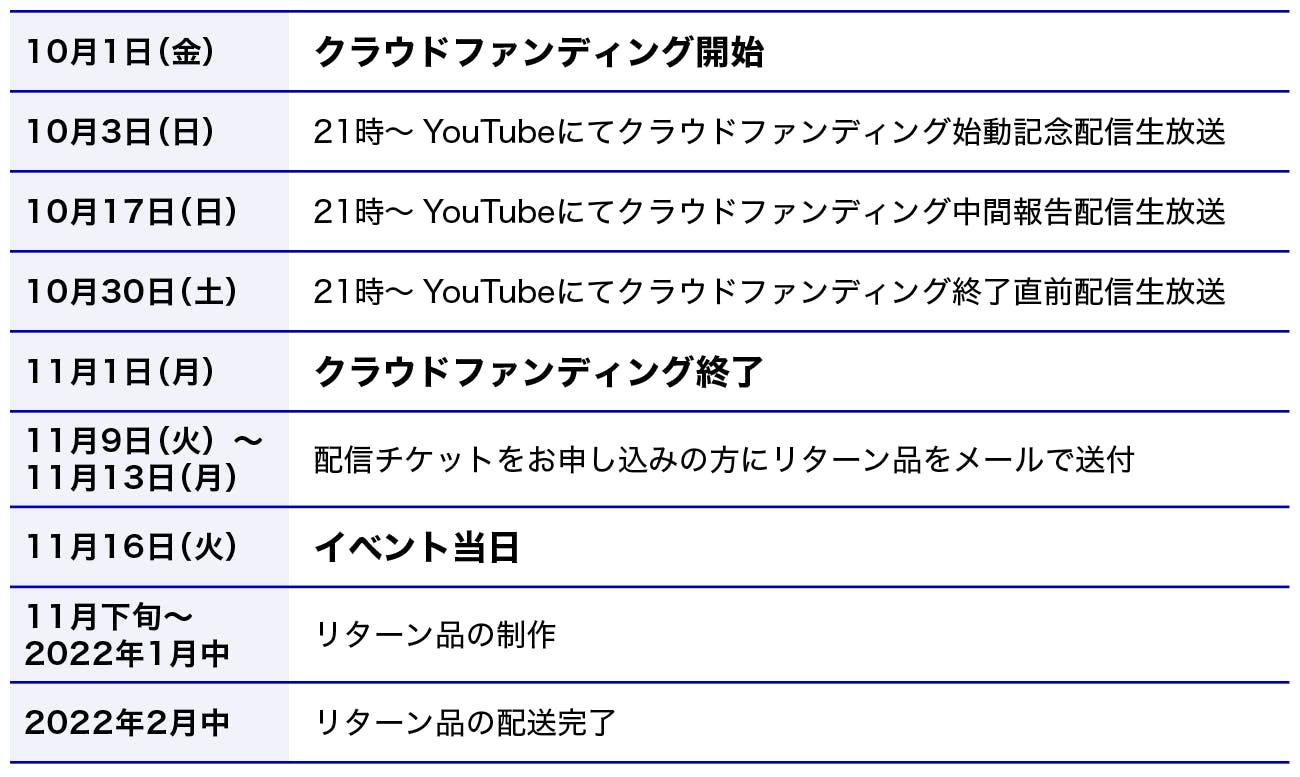 ここまでのご支援をいただきましたら、さらにレベルアップしたリアルイベント第2弾をお届けしたいです!!準備期間等がございますので、早くて来年〜再来年を予定しております。(新型コロナウイルスによる開催制限等が設けられた場合はさらに開催時期を延ばす可能性がございます。ご了承くださいませ)