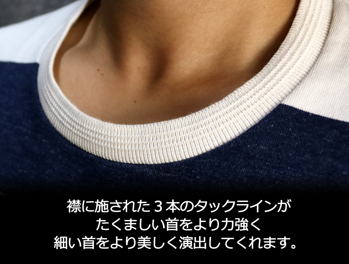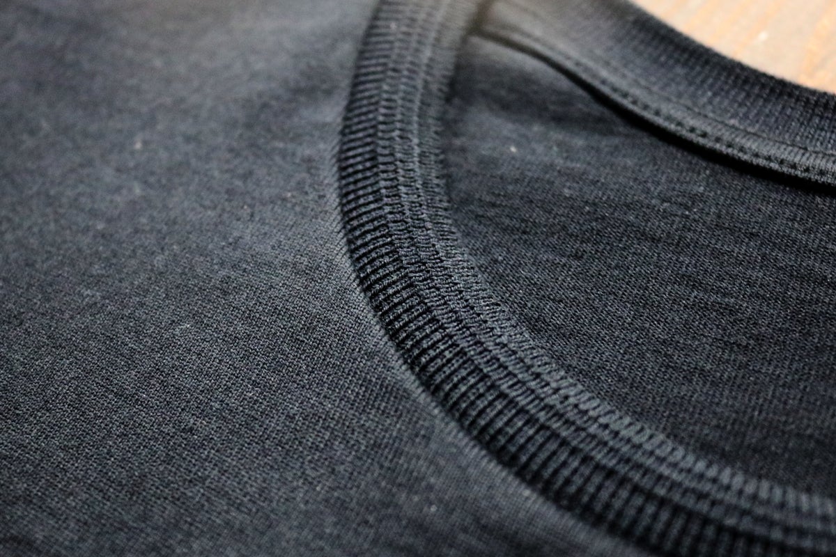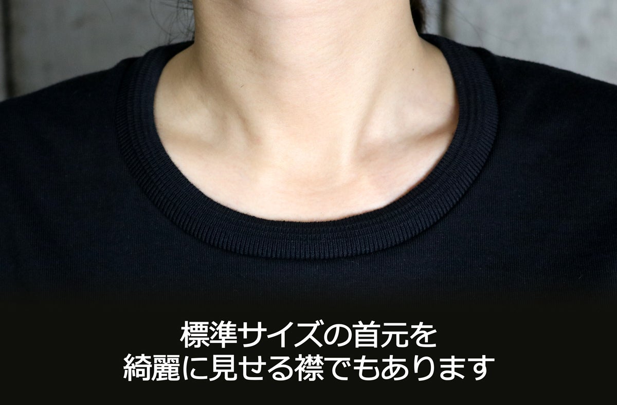 一般的なTシャツの襟は半円と楕円の中間のような形をしています。これを正円に近づけることで襟の円周内の面積は最大化されて首の収まるスペースが広がり喉元が快適になるのです。