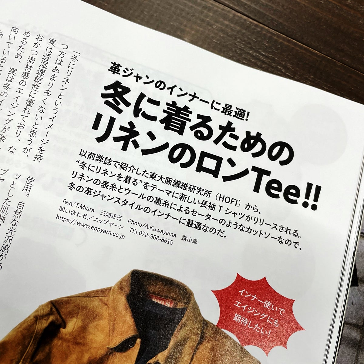 2021/12/02 15:5411月30日に発売された雑誌「Lightning」に東大阪繊維研究所の記事を掲載していただきました!今回のメイン特集「革ジャンと生きていく。」の中の94,95ページ「革ジャンに合うインナーロンT」として2ページに渡って弊社の新商品「HOFI-016 リネンウールモンスターオンス長袖Tシャツ」を紹介していただいています。公開中の「HOFI-014 コネクトTシャツ」は10オンスですが、HOFI-016は13オンスとさらに厚手です。ただ、オンス数は小さくてもコネクトTシャツに使われているペルーコットンは素材そのものに弾力と膨らみがあるので、実際に手にとってみるとコネクトTシャツの方ががっしりとした印象があるかもしれません。プロジェクトの公開期間は残り2週間を切りました。公開中も今回のリターンとなるTシャツの生地に改良を加えていて、頑丈でしっかりした生地感は残しつつ伸縮性を上げるための試作品が出来上がってきています。これからの残り時間にも出来るだけのテストを繰り返して、Tシャツの品質に磨きをかけていきたいと思います! もっと見る