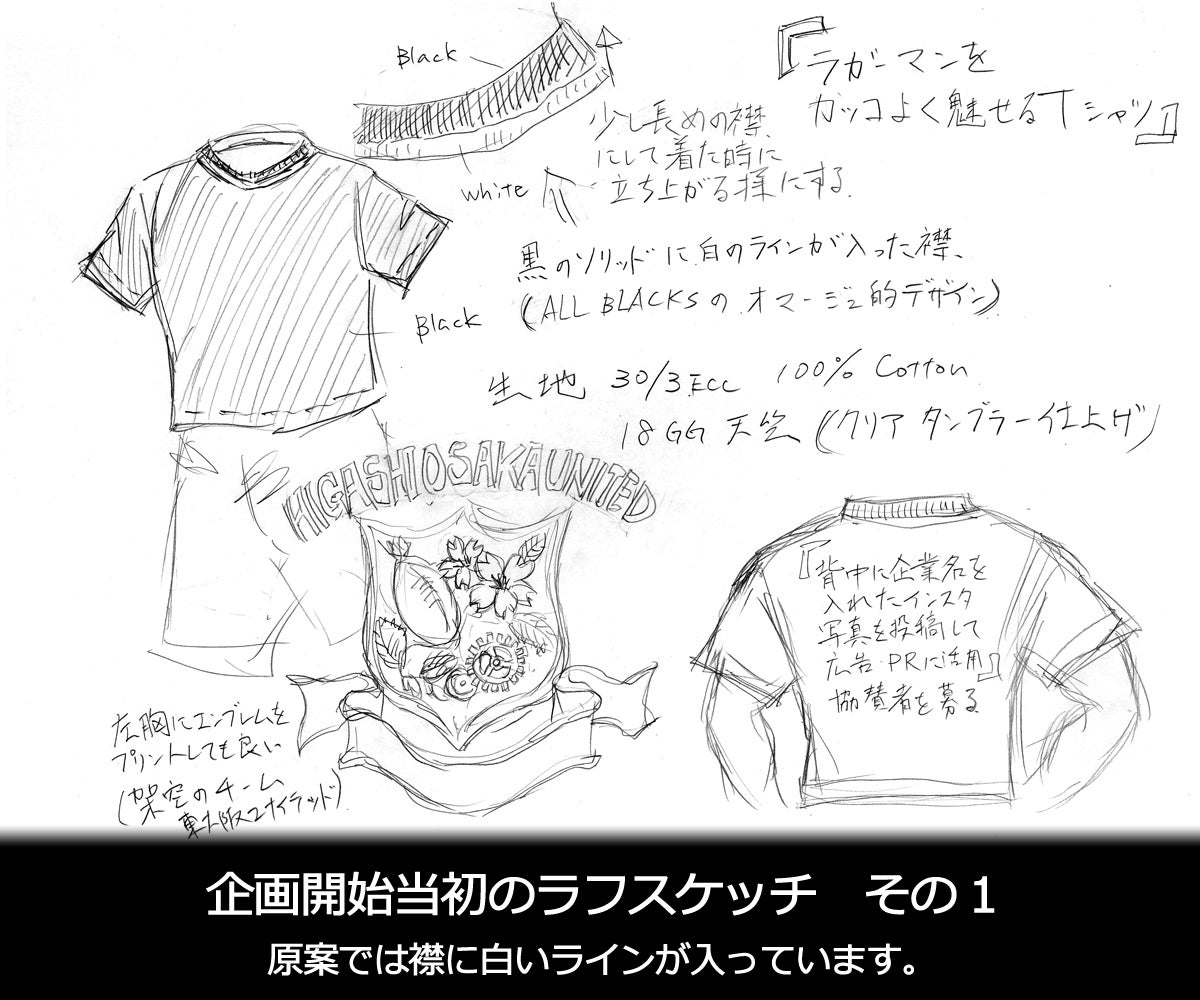 ラガーマンのためにスタートした企画なので今回はラグビーのテイストを入れたいと考えました。そこで思いついたのは架空のチーム「東大阪ユナイテッド」のジャージを作るというアイデアでした。ラグビーチームは試合用に1stから2nd、3rdジャージといくつかのユニフォームを持っていて、それぞれのデザインは全く異なる場合が多いです。これは対戦相手と自チームの1stジャージが似ていた場合に、どちらかが2ndや3rdに変更することで試合中の混乱を回避するためです。