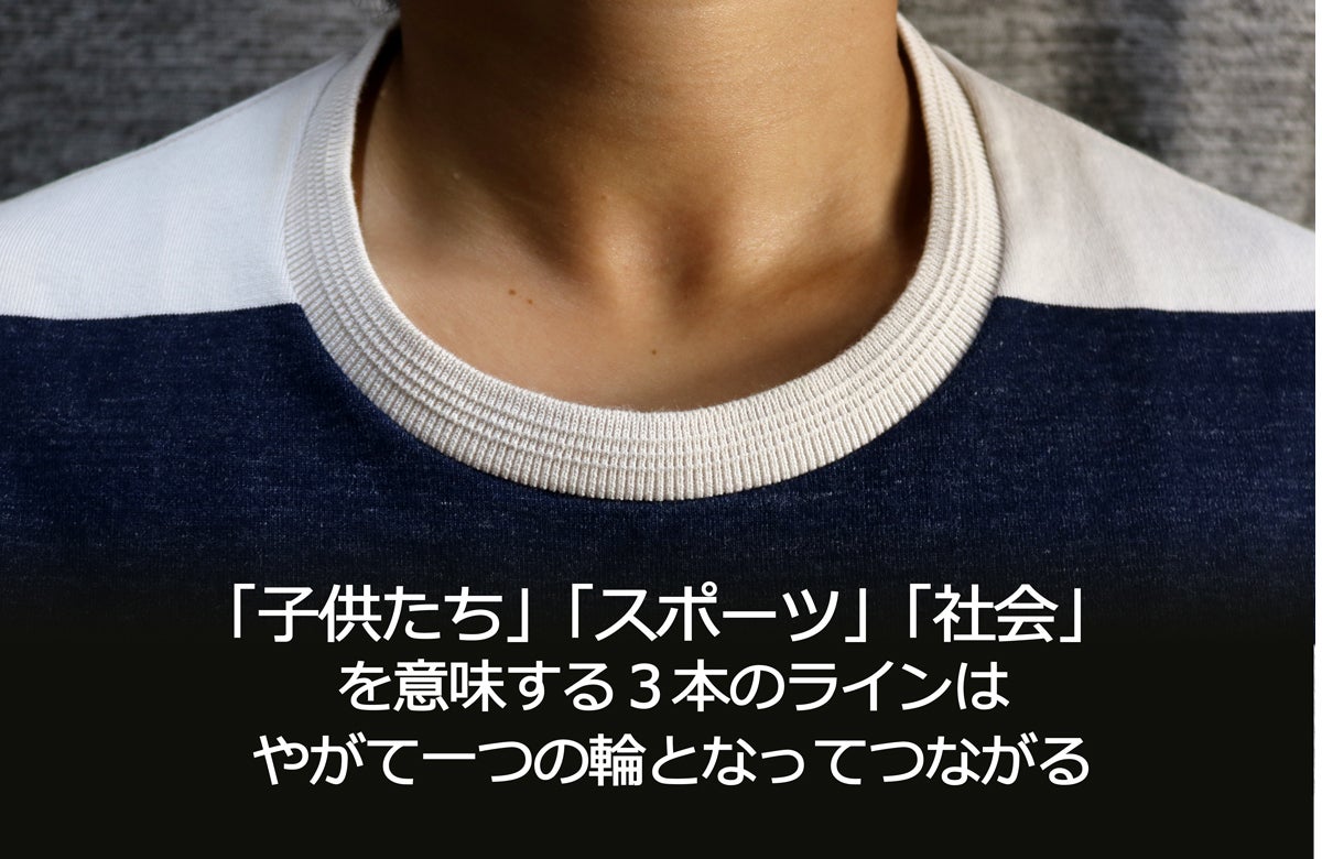 このTシャツの襟には3本のタックラインが入っています。3本の線はそれぞれ「子供たち」「スポーツ」「社会」をイメージしており、それぞれが寄り添いながら1つの輪を作るという理想をこの襟に込めました。