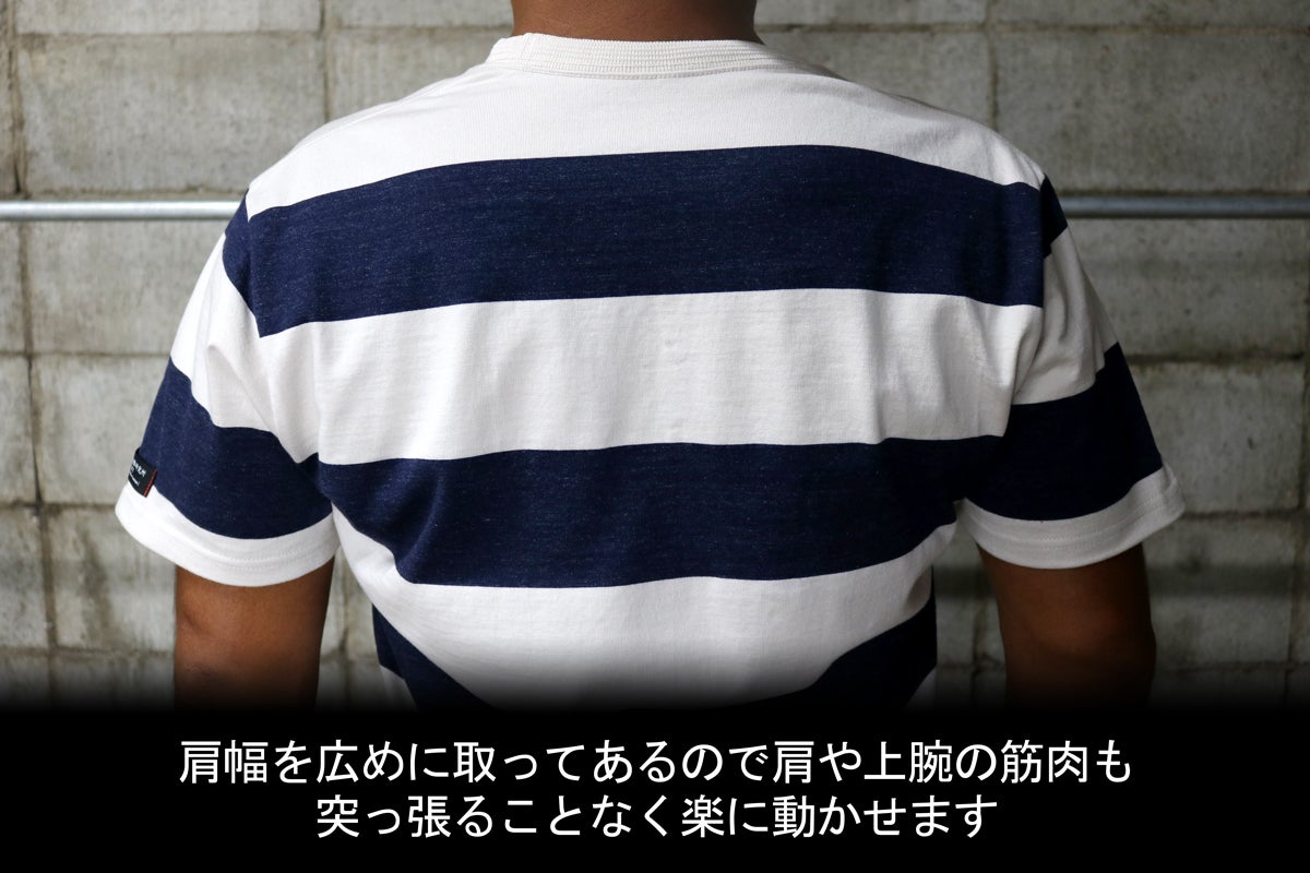 胸と肩の大きな筋肉をスムーズに動かすため、アームホールを広げて肩のラインを少し長くしました。さらに襟を通常よりも少し下げて背中を広くとることで逆三角形の筋肉をそのまま包み込むデザインになっています。ジャストサイズを好むラガーマンが着ても腕や肩の筋肉はスムーズに稼動し快適な着心地を実現します。