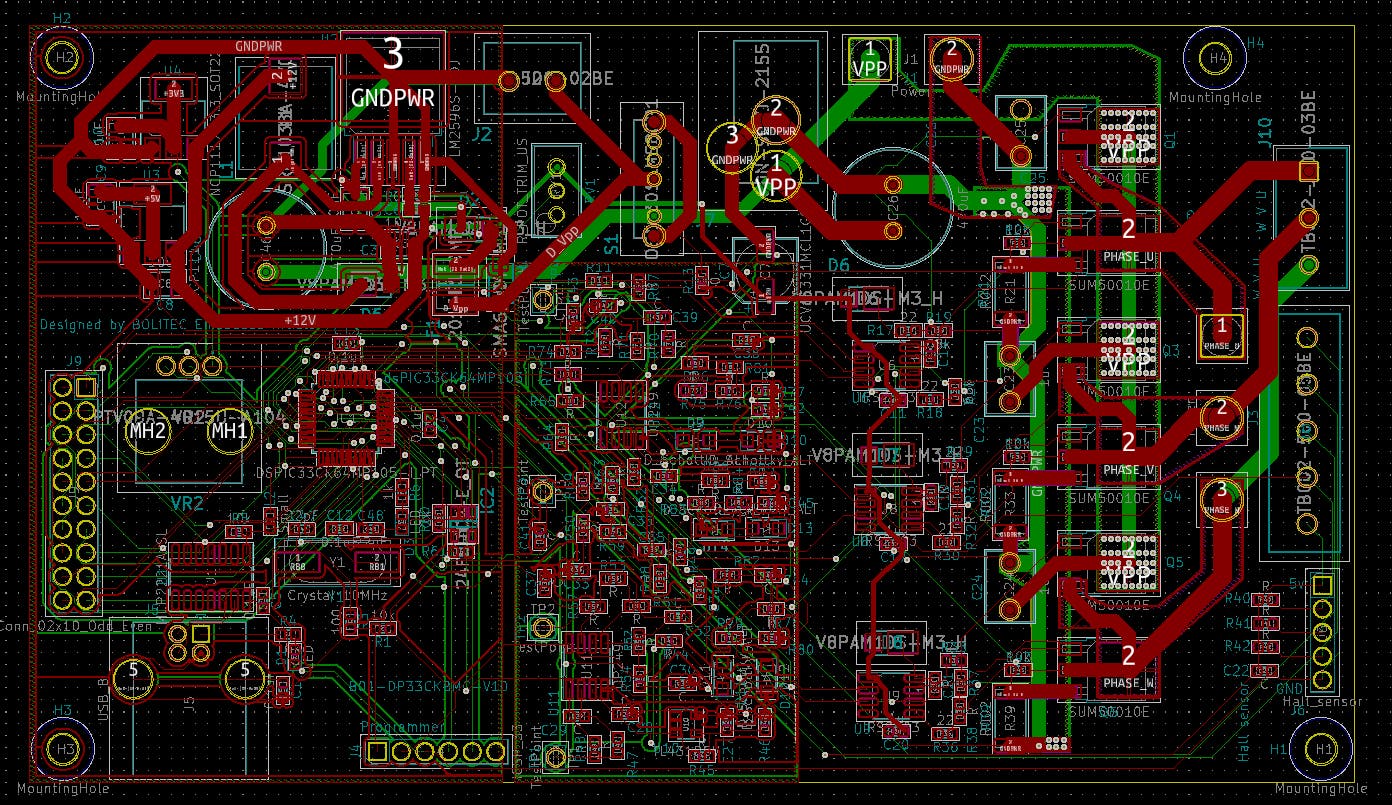 Microchip dsPIC33CK64MP105を使用した三相ブラシレスモーター開発ボードになります.USBシリアル通信が可能なので,リアルタイムでブラシレスモーターの状態をPCで確認することができます.