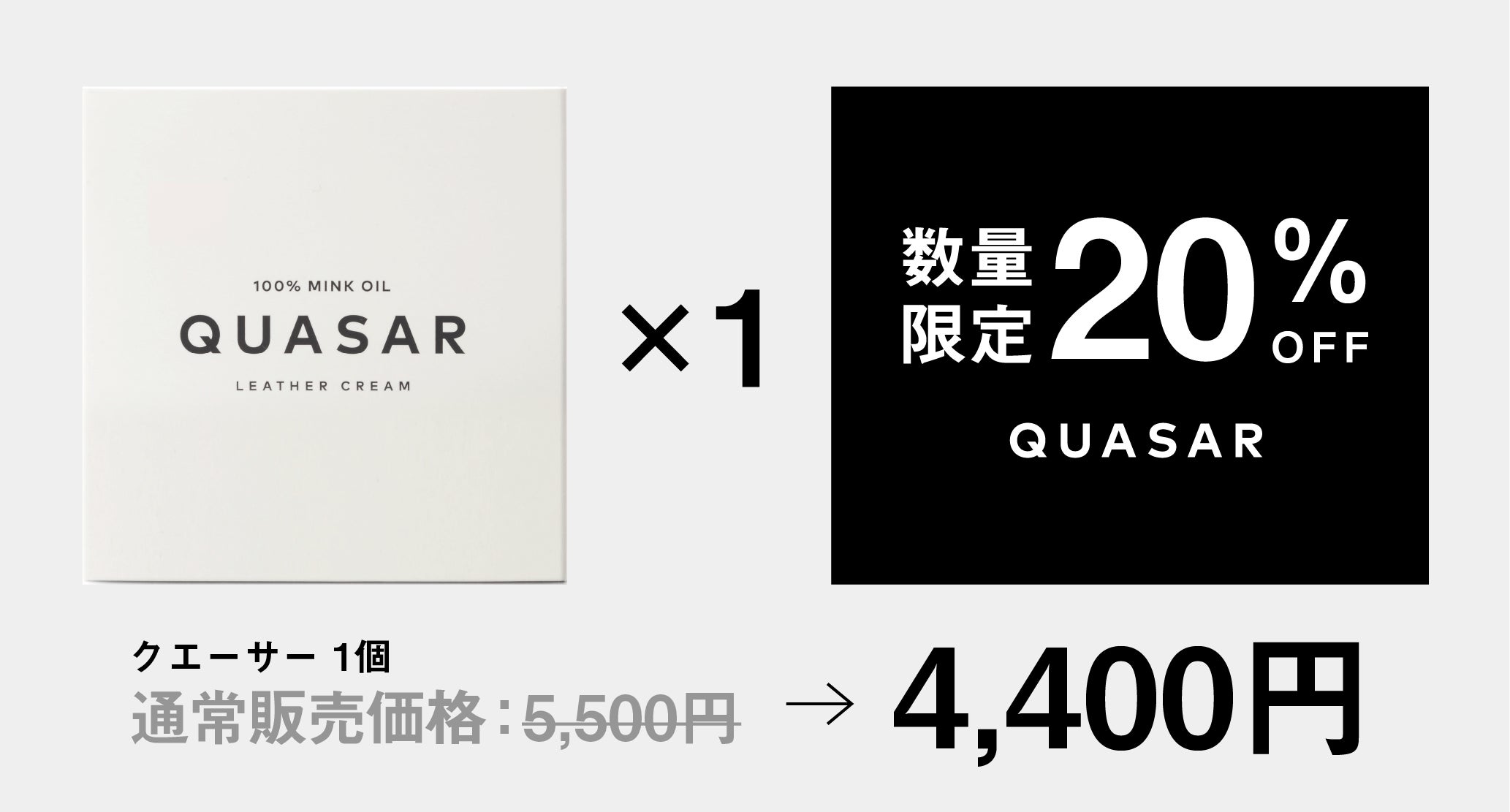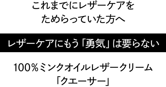 「クエーサー」は、レザー愛好家の皆様のお悩みに対して、油分を素早く革の奥深くへ届ける、というこの化粧品発想で、お悩みを克服できると信じています。